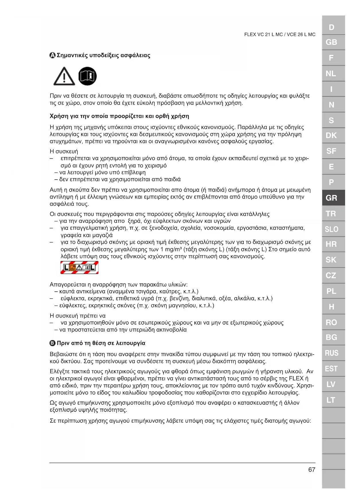 FLEX VC 21 L MC / VCE 26 L MC Σημαντικές υποδείξεις ασφάλειας Πριν να θέσετε σε λειτουργία τη συσκευή, διαβάστε οπωσδήποτε τις οδηγίες λειτουργίας και φυλάξτε τις σε χώρο, στον οποίο θα έχετε εύκολη πρόσβαση για μελλοντική χρήση. Χρήση για την οποία προορίζεται και ορθή χρήση Η χρήση της µηχανής υπόκειται στους ισχύοντες εθνικούς κανονισµούς. Παράλληλα µε τις οδηγίες λειτουργίας και τους ισχύοντες και δεσµευτικούς κανονισµούς στη χώρα χρήσης για την πρόληψη ατυχηµάτων, πρέπει να τηρούνται και οι αναγνωρισµένοι κανόνες ασφαλούς εργασίας.