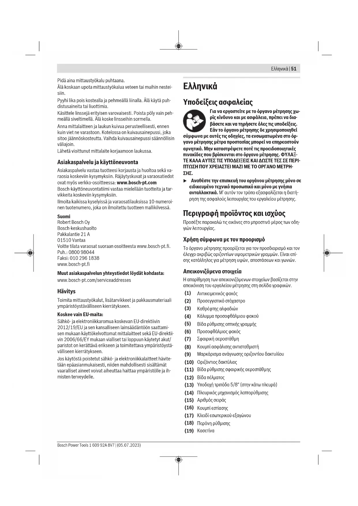u Αναθέστε την επισκευή του οργάνου μέτρησης μόνο σε ειδικευμένο τεχνικό προσωπικό και μόνο με γνήσια ανταλλακτικά. Μ’ αυτόν τον τρόπο εξασφαλίζεται η διατή- ρηση της ασφαλούς λειτουργίας του εργαλείου μέτρησης. Περιγραφή προϊόντος και ισχύος Προσέξτε παρακαλώ τις εικόνες στο μπροστινό μέρος των οδη- γιών λειτουργίας. Χρήση σύμφωνα με τον προορισμό Το όργανο μέτρησης προορίζεται για τον προσδιορισμό και τον έλεγχο ακριβώς οριζοντίων υψομετρικών γραμμών. Είναι επί- σης κατάλληλος για μέτρηση υψών, αποστάσεων και γωνιών. Απεικονιζόμενα στοιχεία Η απαρίθμηση των απεικονιζόμενων στοιχείων βασίζεται στην απεικόνιση του εργαλείου μέτρησης στη σελίδα γραφικών. (1) Αντικειμενικός φακός (2) Προσεγγιστικό στόχαστρο (3) Καθρέφτης αλφαδιών (4) Κάλυμμα προσοφθάλμιου φακού (5) Βίδα ρύθμισης οπτικής γραμμής (6) Προσοφθάλμιος φακός (7) Σφαιρική αεροστάθµη (8) Κουμπί ασφάλισης αντισταθμιστή (9) Μαρκάρισμα ανάγνωσης οριζοντίου δακτυλίου (10) Οριζόντιος δακτύλιος (11) Βίδα ρύθμισης σφαιρικής αεροστάθµης (12) Βίδα πέλματος (13) Υποδοχή τριπόδα 5/8" (στην κάτω πλευρά) (14) Πλευρικός μηχανισμός λεπτορύθμισης (15) Αριθμός σειράς (16) Κουμπί εστίασης (17) Κλειδί εσωτερικού εξαγώνου (18) Περόνη ρύθμισης (19)