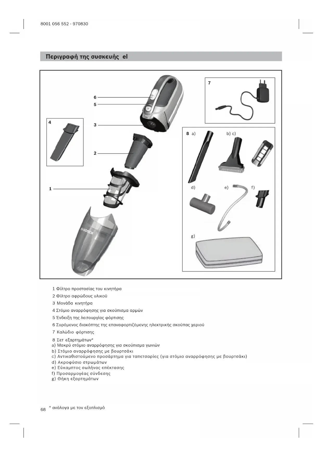 No utilizar productos abrasivos, limpiacristales ni productos de limpieza de uso general. No sumergir nunca el aspirador en agua. Reservado el derecho a introducir modificaciones té- cnicas.68 8001 056 552 - 970830 Περιγραφή της συσκευής el 1 Φίλτρο προστασίας του κινητήρα 2 Φίλτρο αφρώδους υλικού 3 Μονάδα κινητήρα 4 Στόμιο αναρρόφησης για σκούπισμα αρμών 5 Ένδειξη της λειτουργίας φόρτισης 6 Συρόμενος διακόπτης της επαναφορτιζόμενης ηλεκτρικής σκούπας χεριού 7 Καλώδιο φόρτισης 8 Σετ εξαρτημάτων* a) Μακρύ στόμιο αναρρόφησης για σκούπισμα γωνιών b) Στόμιο αναρρόφησης με βουρτσάκι c) Αντικαθιστούμενο προσάρτημα για ταπετσαρίες (για στόμιο αναρρόφησης με βουρτσάκι) d) Ακροφύσιο στρωμάτων e) Εύκαμπτος σωλήνας επέκτασης f) Προσαρμογέας σύνδεσης g) Θήκη εξαρτημάτων
