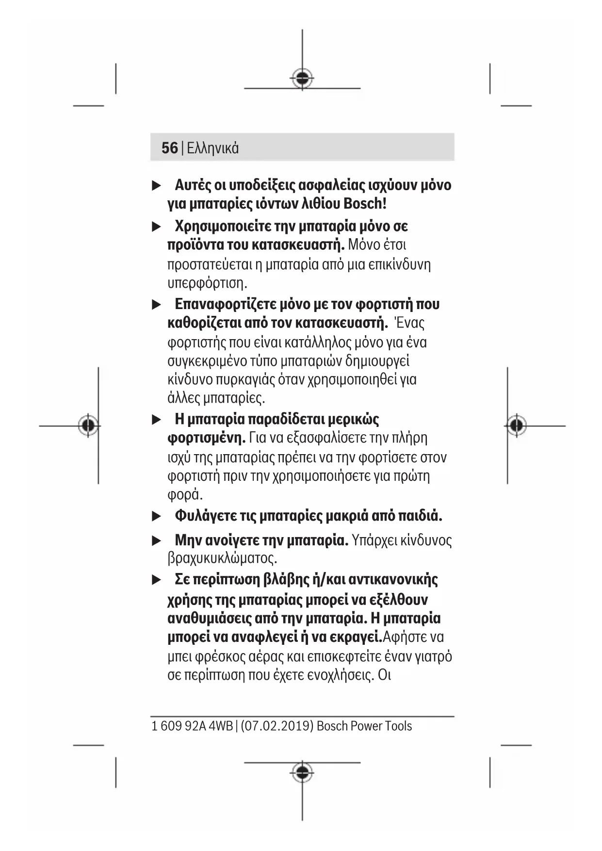 Υποδείξεις ασφαλείας Διαβάστε όλες τις υποδείξεις ασφαλείας και τις οδηγίες. Η μη τήρηση των υποδείξεων ασφαλείας και των οδηγιών μπορεί να προκαλέσει ηλεκτροπληξία, πυρκαγιά και/ή σοβαρούς τραυματισμούς. Φυλάξτε όλες τις προειδοποιητικές υποδείξεις και οδηγίες για κάθε μελλοντική χρήση. Bosch Power Tools 1 609 92A 4WB | (07.02.2019)56 | Ελληνικά u Αυτές οι υποδείξεις ασφαλείας ισχύουν μόνο για μπαταρίες ιόντων λιθίου Bosch! u Χρησιμοποιείτε την μπαταρία μόνο σε προϊόντα του κατασκευαστή. Μόνο έτσι προστατεύεται η μπαταρία από μια επικίνδυνη υπερφόρτιση. u Επαναφορτίζετε μόνο με τον φορτιστή που καθορίζεται από τον κατασκευαστή. Ένας φορτιστής που είναι κατάλληλος μόνο για ένα συγκεκριμένο τύπο μπαταριών δημιουργεί κίνδυνο πυρκαγιάς όταν χρησιμοποιηθεί για άλλες μπαταρίες. u Η μπαταρία παραδίδεται μερικώς φορτισμένη. Για να εξασφαλίσετε την πλήρη ισχύ της μπαταρίας πρέπει να την φορτίσετε στον φορτιστή πριν την χρησιμοποιήσετε για πρώτη