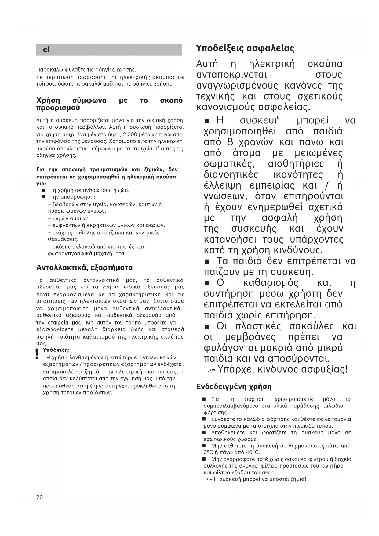 Αυτή η συσκευή προορίζεται μόνο για την οικιακή χρήση και το οικιακό περιβάλλον. Αυτή η συσκευή προορίζεται για χρήση μέχρι ένα μέγιστο ύψος 2.000 μέτρων πάνω από την επιφάνεια της θάλασσας. Χρησιμοποιείτε την ηλεκτρική σκούπα αποκλειστικά σύμφωνα με τα στοιχεία σ’ αυτές τις οδηγίες χρήσης.Για την αποφυγή τραυματισμών και ζημιών, δεν επιτρέπεται να χρησιμοποιηθεί η ηλεκτρική σκούπα τη χρήση σε ανθρώπους ή ζώα. την απορρόφηση: − βλαβερών στην υγεία, κοφτερών, καυτών ή πυρακτωμένων υλικών. − υγρών ουσιών. − εύφλεκτων ή εκρηκτικών υλικών και αερίων. − στάχτης, αιθάλης από τζάκια και κεντρικές θερμάνσεις. − σκόνης μελανιού από εκτυπωτές και φωτοαντιγραφικά μηχανήματα. Ανταλλακτικά, εξαρτήματα Τα αυθεντικά ανταλλακτικά μας, τα αυθεντικά αξεσουάρ μας και τα γνήσια ειδικά αξεσουάρ μας είναι εναρμονισμένα με τα χαρακτηριστικά και τις απαιτήσεις των ηλεκτρικών σκουπών μας. Συνιστούμε να χρησιμοποιείτε μόνο αυθεντικά ανταλλακτικά, αυθεντικά αξεσουάρ και αυθεντικά αξεσουάρ από την εταιρεία μας. Με αυτόν τον τρόπο μπορείτε να εξασφαλίσετε μεγάλη διάρκεια ζωής και σταθερά υψηλή ποιότητα καθαρισμού της ηλεκτρικής σκούπας σας. Υπόδειξη: Η χρήση λανθασμένων ή κατώτερων ανταλλακτικών, εξαρτημάτων / προαιρετικών εξαρτημάτων ενδέχεται να προκαλέσει ζημιά στην ηλεκτρική σκούπα σας, η οποία δεν καλύπτεται από την εγγύησή μας, υπό την προϋπόθεση ότι η ζημία αυτή έχει προκληθεί από τη χρήση τέτοιων προϊόντων.