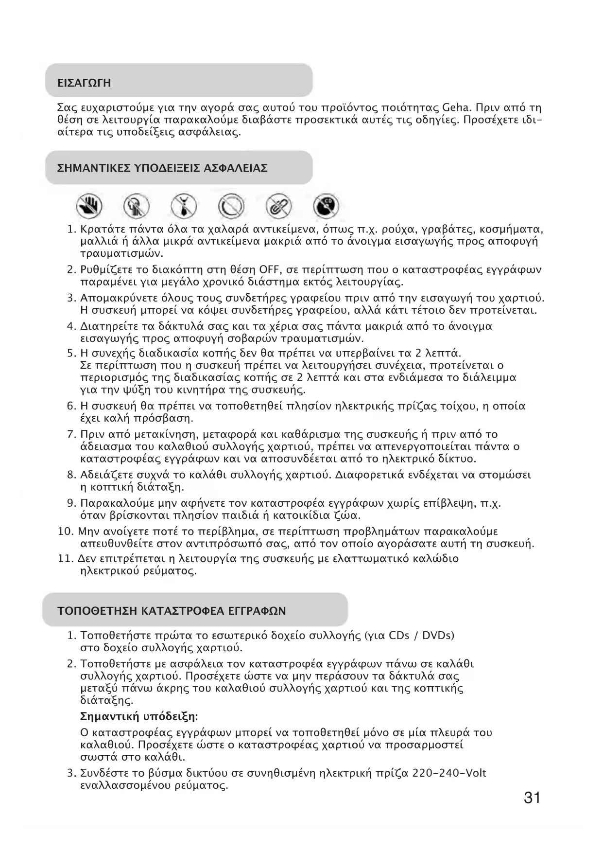 Κατεβάστε τις οδηγίες για το καταστροφέας εγγράφων σε μορφή PDF δωρεάν! Βρείτε το εγχειρίδιό σας Home & Office X7 CD - GEHA και πάρτε ξανά την ηλεκτρονική σας συσκευή στα χέρια σας. Σε αυτή τη σελίδα δημοσιεύονται όλα τα έγγραφα που απαιτούνται για τη χρήση της συσκευής σας. Home & Office X7 CD της μάρκας GEHA.