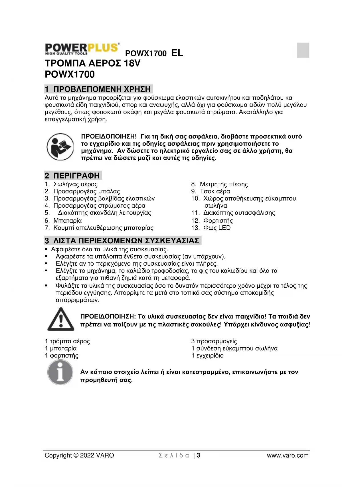 - Μη χρησιμοποιείτε αυτόν τον φουσκωτή για ψεκασμό χημικών ουσιών. Οι πνεύμονές σας μπορεί να καταστραφούν εισπνέοντας τοξικούς καπνούς.POWX1700 EL Copyright © 2022 VARO Σ ε λ ί δ α | 7 www.varo.com