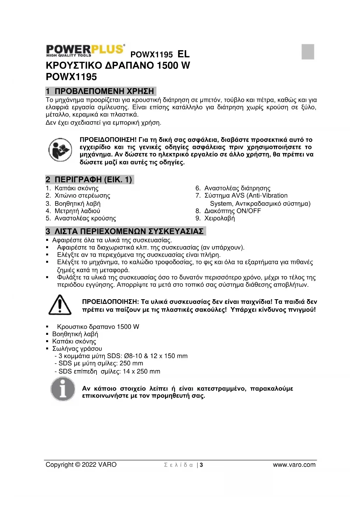 - 17 ΔΗΛΩΣΗ ΣΥΜΜΟΡΦΩΣΗΣ POWX1195 EL Copyright © 2022 VARO Σ ε λ ί δ α | 3 www.varo.com ΚΡΟΥΣΤΙΚΟ ΔΡΑΠΑΝΟ 1500 W POWX1195 1 ΠΡΟΒΛΕΠΟΜΕΝΗ ΧΡΗΣΗ Το μηχάνημα προορίζεται για κρουστική διάτρηση σε μπετόν, τούβλο και πέτρα, καθώς και για ελαφριά εργασία σμίλευσης. Είναι επίσης κατάλληλο για διάτρηση χωρίς κρούση σε ξύλο, μέταλλο, κεραμικά και πλαστικά. Δεν έχει σχεδιαστεί για εμπορική χρήση. ΠΡΟΕΙΔΟΠΟΙΗΣΗ! Για τη δική σας ασφάλεια, διαβάστε προσεκτικά αυτό το εγχειρίδιο και τις γενικές οδηγίες ασφάλειας πριν χρησιμοποιήσετε το μηχάνημα. Αν δώσετε το ηλεκτρικό εργαλείο σε άλλο χρήστη, θα πρέπει να δώσετε μαζί και αυτές τις οδηγίες. 2 ΠΕΡΙΓΡΑΦΗ (ΕΙΚ. 1) p. 12