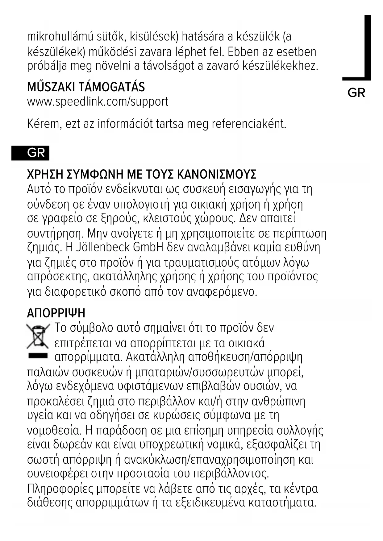 Το σύμβολο αυτό σημαίνει ότι το προϊόν δεν επιτρέπεται να απορρίπτεται με τα οικιακά απορρίμματα. Ακατάλληλη αποθήκευση/απόρριψη παλαιών συσκευών ή μπαταριών/συσσωρευτών μπορεί, λόγω ενδεχόμενα υφιστάμενων επιβλαβών ουσιών, να προκαλέσει ζημιά στο περιβάλλον και/ή στην ανθρώπινη υγεία και να οδηγήσει σε κυρώσεις σύμφωνα με τη νομοθεσία. Η παράδοση σε μια επίσημη υπηρεσία συλλογής είναι δωρεάν και είναι υποχρεωτική νομικά, εξασφαλίζει τη σωστή απόρριψη ή ανακύκλωση/επαναχρησιμοποίηση και συνεισφέρει στην προστασία του περιβάλλοντος. Πληροφορίες μπορείτε να λάβετε από τις αρχές, τα κέντρα διάθεσης απορριμμάτων ή τα εξειδικευμένα καταστήματα.Τα μεγάλα καταστήματα λιανικής (καταστήματα ηλεκτρικών και ηλεκτρονικών ειδών με μια επιφάνεια ≥ 400m²) παραλαμβάνουν δωρεάν τις μικρές συσκευές (όλες οι διαστάσεις < 25εκ.) και άλλα μόνο στην περίπτωση αγοράς παρόμοιων προϊόντων. Αφαιρείτε εφόσον είναι δυνατό τις μπαταρίες/τους συσσωρευτές. ΚΙΝΔΎΝΟΙ ΓΙΑ ΤΉΝ ΎΓΕΙΑ Σε εξαιρετικά μακρά χρήση συσκευών εισαγωγής, μπορεί να εμφανιστούν ενοχλήσεις στην υγεία όπως σωματική δυσφορία ή πόνοι. Κάνετε τακτικά διαλείμματα και αναζητάτε ιατρική συμβουλή σε επίμονα προβλήματα. ΎΠΟΔΕΙΞΉ ΣΎΜΜΟΡΦΩΣΉΣ Υπό την επίδραση δυνατών στατικών, ηλεκτρικών πεδίων ή πεδίων υψηλής συχνότητας (ασύρματες εγκαταστάσεις, κινητά τηλέφωνα, αποφορτίσεις συσκευών μικροκυμάτων) ίσως υπάρξουν επιδράσεις στη λειτουργία της συσκευής (των συσκευών). Σε αυτή την περίπτωση δοκιμάστε να αυξήσετε την απόσταση προς τις συσκευές που δημιουργούν παρεμβολή. ΤΕΧΝΙΚΉ ΎΠΟΣΤΉΡΙΞΉ www.speedlink.com/support Παρακαλούμε φυλάξτε αυτές τις πληροφορίες για μελλοντική αναφορά.