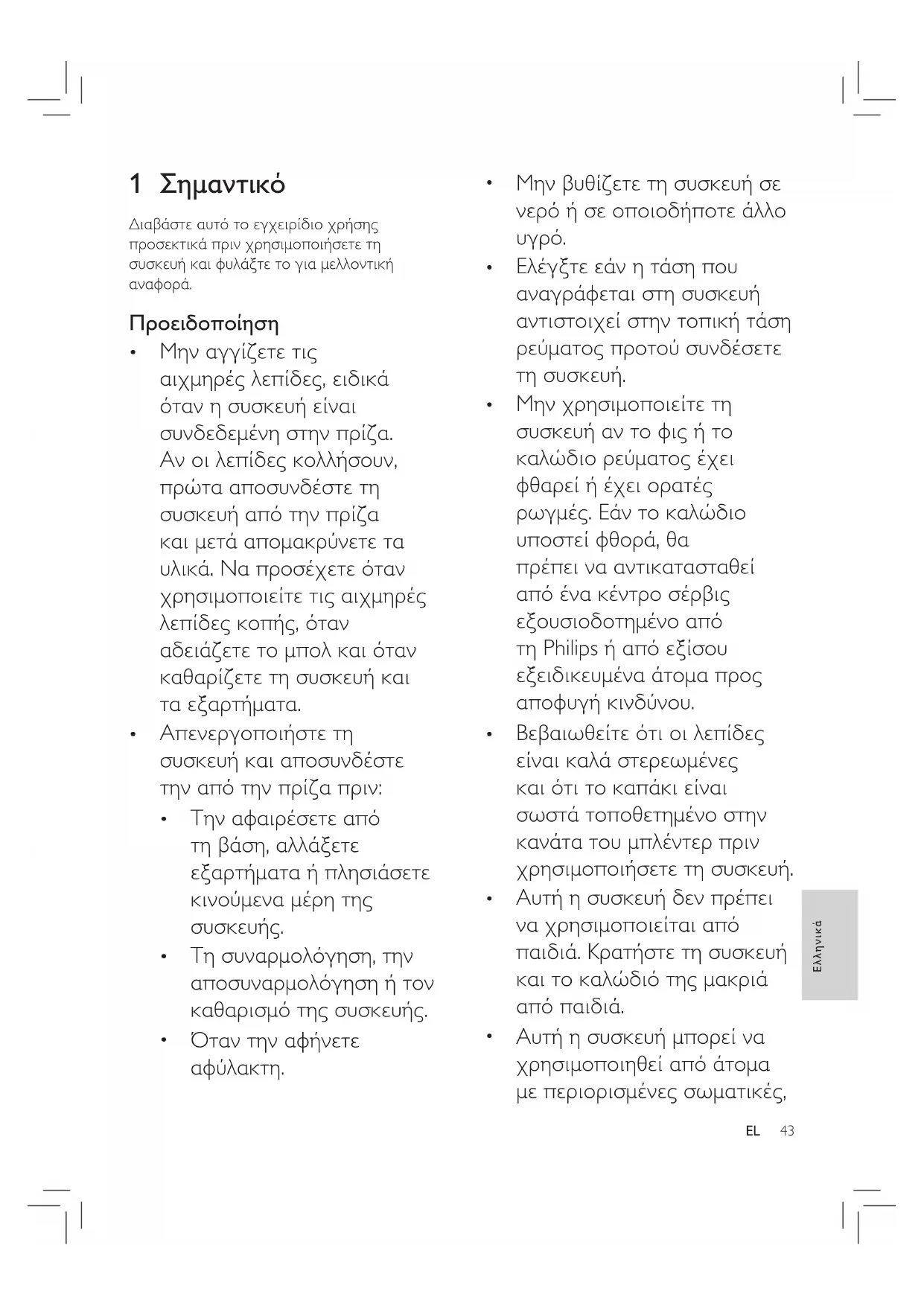 Μην χρησιμοποιείτε τη συσκευή αν το φις ή το καλώδιο ρεύματος έχει φθαρεί ή έχει ορατές ρωγμές. Εάν το καλώδιο υποστεί φθορά, θα πρέπει να αντικατασταθεί από ένα κέντρο σέρβις εξουσιοδοτημένο από τη Philips ή από εξίσου εξειδικευμένα άτομα προς αποφυγή κινδύνου.