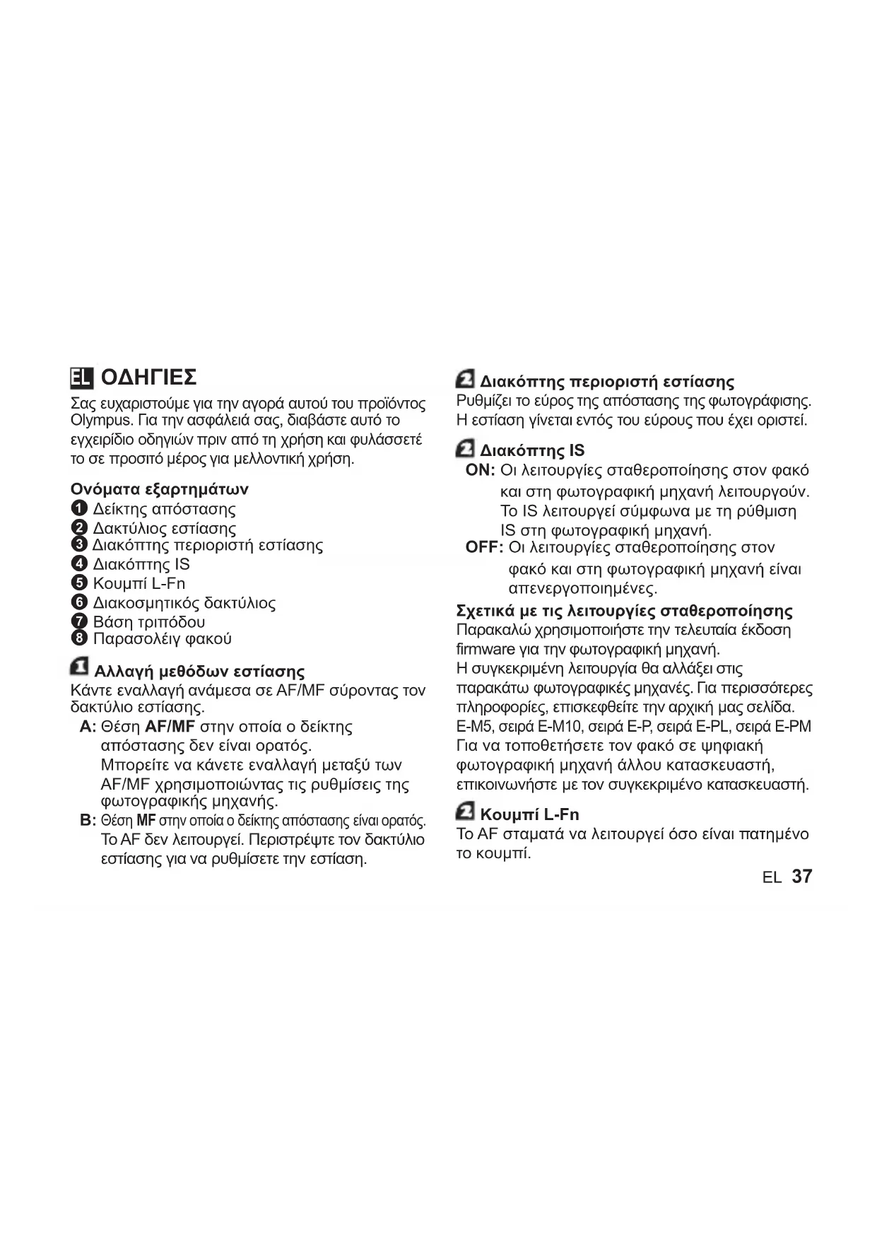 Σας ευχαριστούμε για την αγορά αυτού του προϊόντος Olympus. Για την ασφάλειά σας, διαβάστε αυτό το εγχειρίδιο οδηγιών πριν από τη χρήση και φυλάσσετέ το σε προσιτό μέρος για μελλοντική χρήση. Ονόματα εξαρτημάτων 1 Δείκτης απόστασης 2 Δακτύλιος εστίασης 3 Διακόπτης περιοριστή εστίασης 4 Διακόπτης IS 5 Κουμπί L-Fn 6 Διακοσμητικός δακτύλιος 7 Βάση τριπόδου 8 Παρασολέιγ φακού Αλλαγή μεθόδων εστίασης Κάντε εναλλαγή ανάμεσα σε AF/MF σύροντας τον δακτύλιο εστίασης.