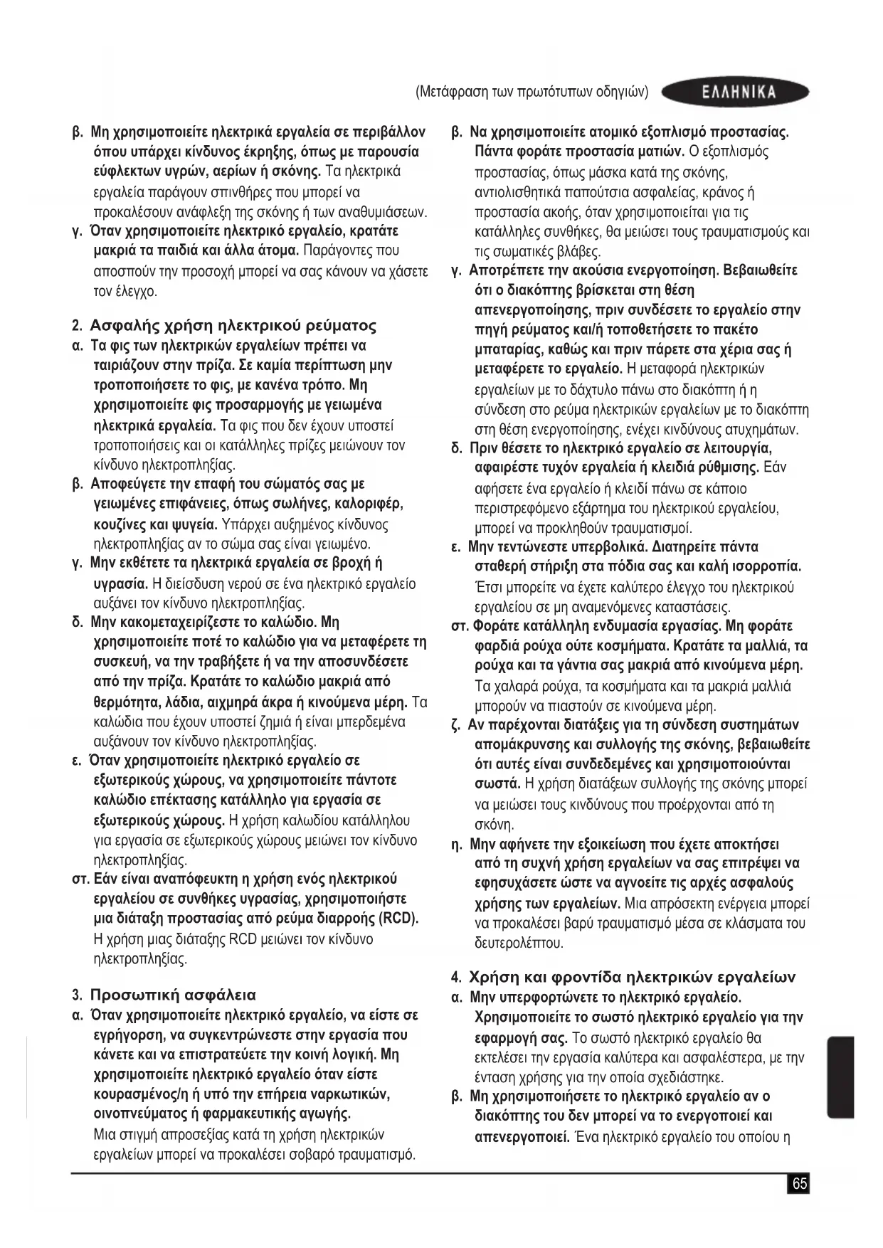 στ. Εάν είναι αναπόφευκτη η χρήση ενός ηλεκτρικού εργαλείου σε συνθήκες υγρασίας, χρησιμοποιήστε μια διάταξη προστασίας από ρεύμα διαρροής (RCD). Η χρήση μιας διάταξης RCD μειώνει τον κίνδυνο ηλεκτροπληξίας.