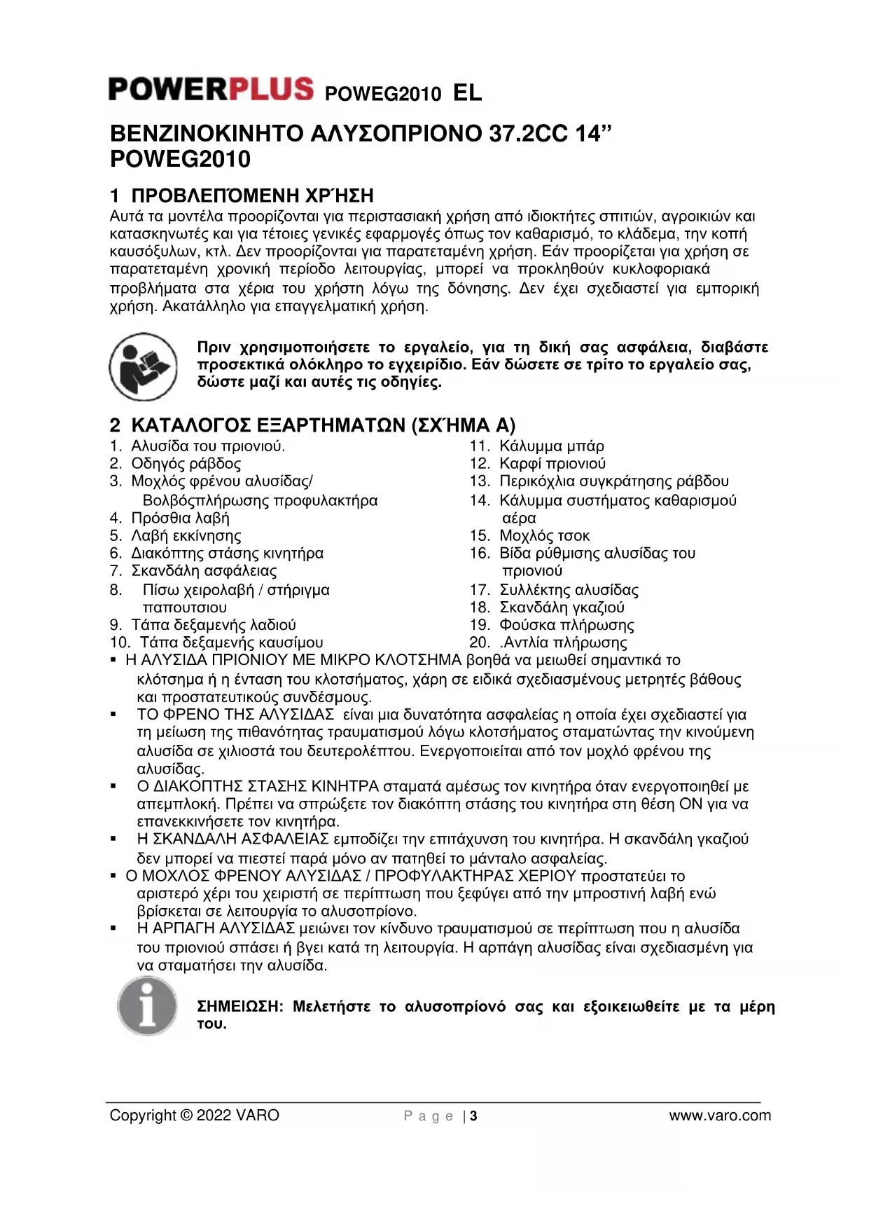 - 18 ΔΉΛΩΣΗ ΣΥΜΜΌΡΦΩΣΗΣ POWEG2010 EL Copyright © 2022 VARO P a g e | 3 www.varo.com ΒΕΝΖΙΝΟΚΙΝΗΤΟ ΑΛΥΣΟΠΡΙΟΝΟ 37.2CC 14” POWEG2010 1 ΠΡΟΒΛΕΠΌΜΕΝΗ ΧΡΉΣΗ Αυτά τα μοντέλα προορίζονται για περιστασιακή χρήση από ιδιοκτήτες σπιτιών, αγροικιών και κατασκηνωτές και για τέτοιες γενικές εφαρμογές όπως τον καθαρισμό, το κλάδεμα, την κοπή καυσόξυλων, κτλ. Δεν προορίζονται για παρατεταμένη χρήση. Εάν προορίζεται για χρήση σε παρατεταμένη χρονική περίοδο λειτουργίας, μπορεί να προκληθούν κυκλοφοριακά προβλήματα στα χέρια του χρήστη λόγω της δόνησης. Δεν έχει σχεδιαστεί για εμπορική χρήση. Ακατάλληλο για επαγγελματική χρήση. Πριν χρησιμοποιήσετε το εργαλείο, για τη δική σας ασφάλεια, διαβάστε προσεκτικά ολόκληρο το εγχειρίδιο. Εάν δώσετε σε τρίτο το εργαλείο σας, δώστε μαζί και αυτές τις οδηγίες. 2 ΚΑΤΑΛΟΓΟΣ ΕΞΑΡΤΗΜΑΤΩΝ (ΣΧΉΜΑ A) p. 23