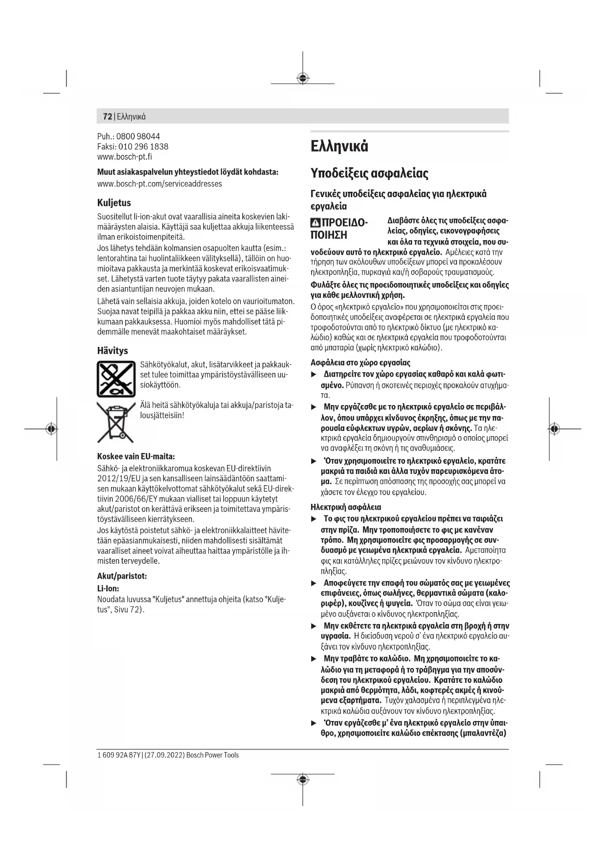 u Χρησιμοποιείτε τα ηλεκτρικά εργαλεία μόνο με τις ειδι- κά σχεδιασμένες μπαταρίες. Η χρήση άλλων μπαταριών μπορεί να οδηγήσει σε τραυματισμούς και να δημιουργήσει κίνδυνο πυρκαγιάς. Bosch Power Tools 1 609 92A 87Y | (27.09.2022)74 | Ελληνικά u Όταν η μπαταρία δε χρησιμοποιείται, κρατήστε την μα- κριά από άλλα μεταλλικά αντικείμενα, όπως συνδετή- ρες χαρτιών, νομίσματα, κλειδιά, καρφιά, βίδες ή άλλα μικρά μεταλλικά αντικείμενα που μπορούν να βραχυκυ- κλώσουν τις επαφές της μπαταρίας. Ένα βραχυκύκλωμα των επαφών της μπαταρίας μπορεί να προκαλέσει τραυματι- σμούς ή φωτιά. u Μια τυχόν εσφαλμένη χρήση μπορεί να οδηγήσει σε διαρροή υγρών από την μπαταρία. Αποφεύγετε κάθε επαφή μ’ αυτά. Σε περίπτωση τυχαίας επαφής ξεπλύνε- τε καλά με νερό. Εάν τα υγρά έρθουν σε επαφή με τα μάτια, ζητήστε επιπλέον ιατρική βοήθεια. Διαρρέοντα υγρά μπαταρίας μπορεί να οδηγήσουν σε ερεθισμούς του δέρματος ή σε εγκαύματα. u Μην χρησιμοποιείτε μπαταρία ή εργαλείο που είναι κα- τεστραμμένο ή τροποποιημένο. Οι χαλασμένες ή τροπο- ποιημένες μπαταρίες μπορεί να παρουσιάσουν μια απρόβλεπτη συμπεριφορά και να οδηγήσουν σε φωτιά, έκρηξη ή σε κίνδυνο τραυματισμού. u Μην εκθέτετε μια μπαταρία ή ένα εργαλείο μπαταρίας σε φωτιά ή σε πολύ υψηλές θερμοκρασίες. Η έκθεση στη φωτιά ή σε θερμοκρασία πάνω από τους 130 °C μπορεί να προκαλέσει έκρηξη. u Τηρείτε όλες τις υποδείξεις για τη φόρτιση και μη φορ- τίζετε την μπαταρία ή το εργαλείο μπαταρίας ποτέ εκτός της περιοχής θερμοκρασίας που αναφέρεται στις οδηγίες λειτουργίας. Η λάθος φόρτιση ή η φόρτιση εκτός της επιτρεπτής περιοχής θερμοκρασίας μπορεί να κατα- στρέψει την μπαταρία και να αυξήσει τον κίνδυνο πυρκα-