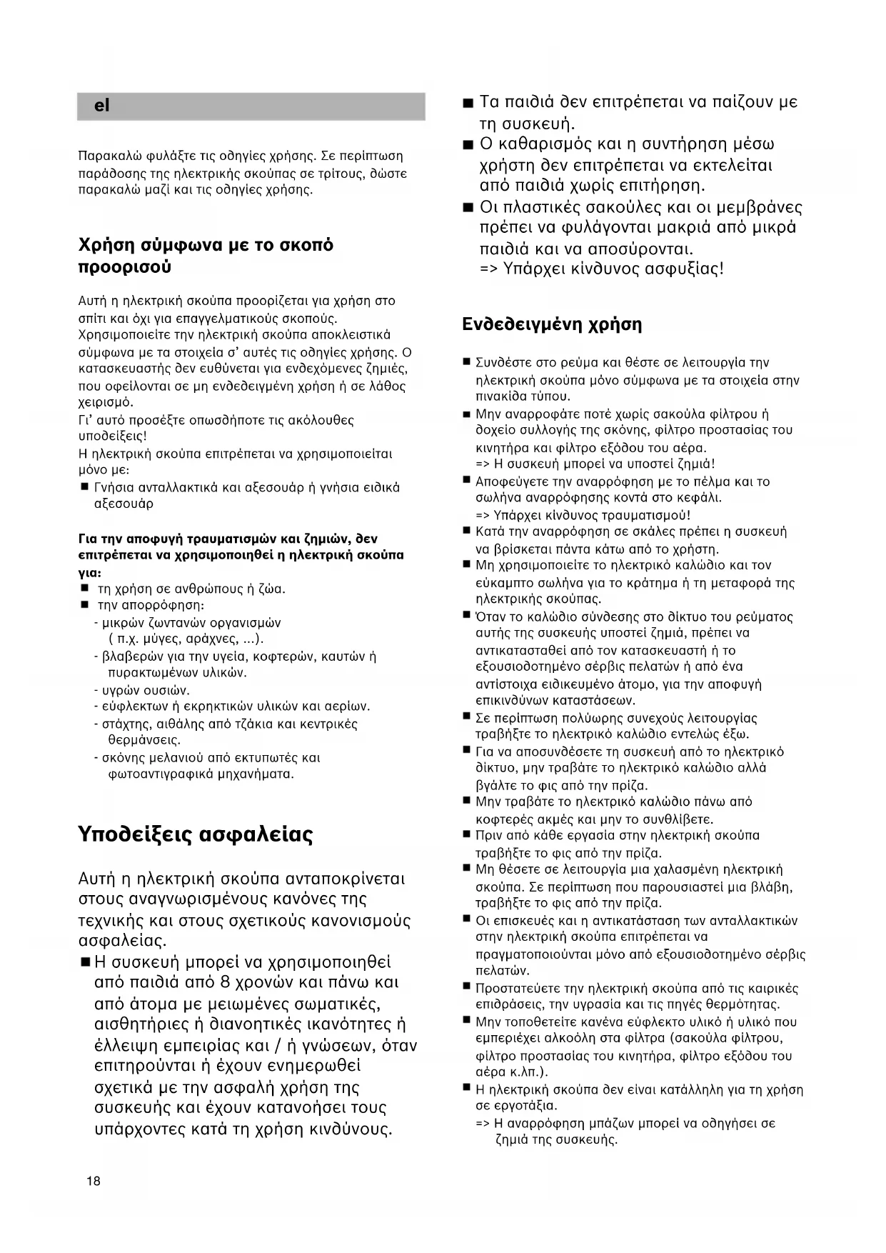 Παρακαλώ φυλάξτε τις οδηγίες χρήσης. Σε περίπτωση παράδοσης της ηλεκτρικής σκούπας σε τρίτους, δώστε παρακαλώ µαζί και τις οδηγίες χρήσης. Χρήση σύµφωνα µε το σκοπό