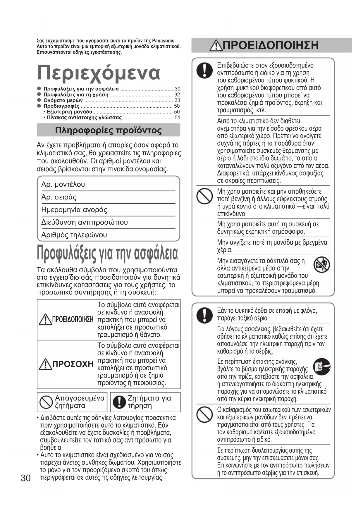 - • Πίνακας αντίστοιχης γλώσσας Περιεχόμενα Προφυλάξεις για την ασφάλεια Πληροφορίες προϊόντος Αν έχετε προβλήματα ή απορίες όσον αφορά το κλιματιστικό σας, θα χρειαστείτε τις πληροφορίες που ακολουθούν. Οι αριθμοί μοντέλου και σειράς βρίσκονται στην πινακίδα ονομασίας. Αρ. μοντέλου p. 51