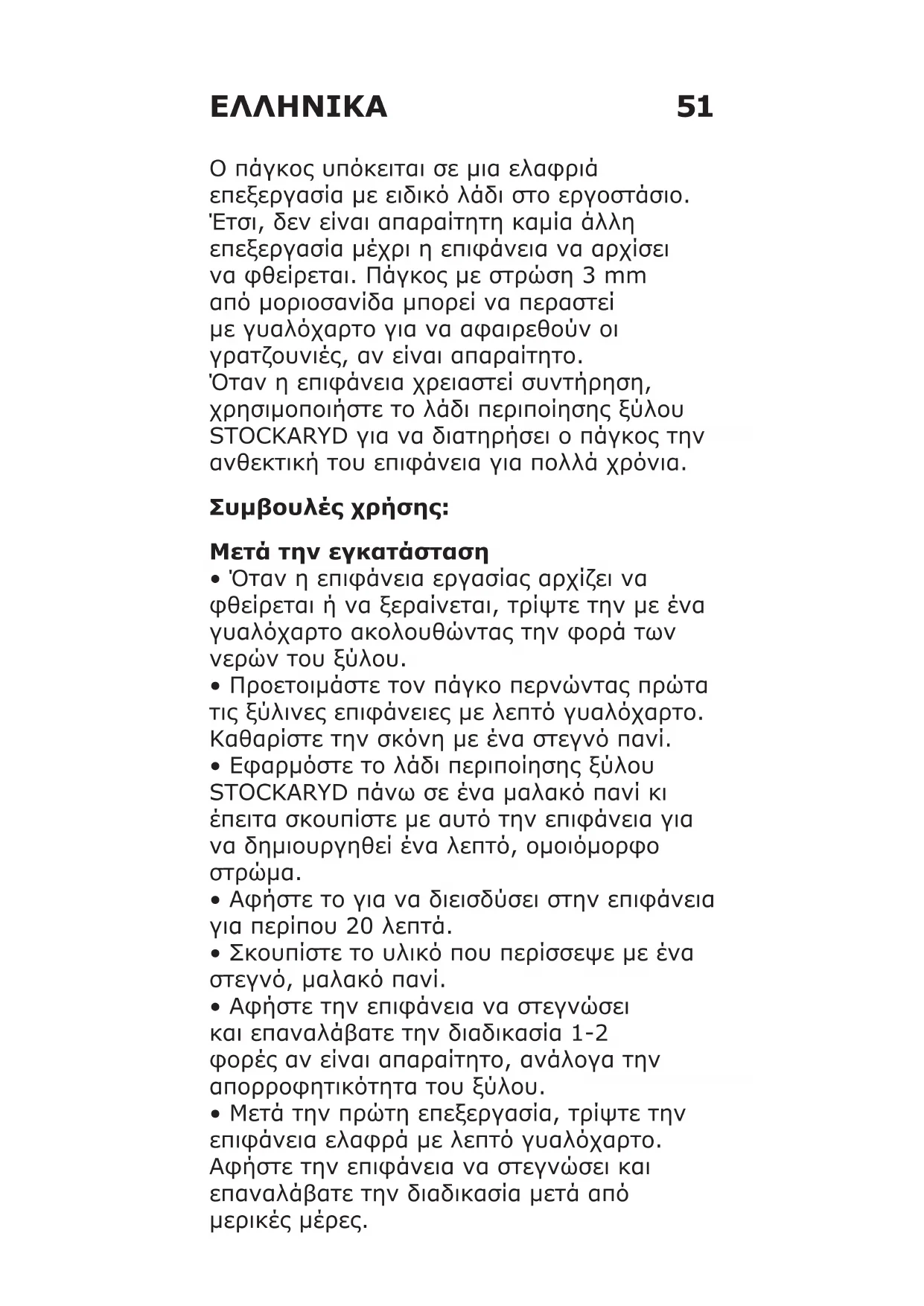 - Nikad ne upotrebljavati čeličnu žicu, grubu spužvicu, sredstvo za ribanje ili slične proizvode jer mogu izgrebati površinu. UPOZORENJE Krpe natopljene ovim proizvodom natopiti u vodu odmah nakon upotrebe ili spremiti u hermetički zatvorenu staklenu ili metalnu posudu kako bi se spriječila opasnost od samozapaljenja.51 Ο πάγκος υπόκειται σε μια ελαφριά επεξεργασία με ειδικό λάδι στο εργοστάσιο. Έτσι, δεν είναι απαραίτητη καμία άλλη επεξεργασία μέχρι η επιφάνεια να αρχίσει να φθείρεται. Πάγκος με στρώση 3 mm από μοριοσανίδα μπορεί να περαστεί με γυαλόχαρτο για να αφαιρεθούν οι γρατζουνιές, αν είναι απαραίτητο. Όταν η επιφάνεια χρειαστεί συντήρηση, χρησιμοποιήστε το λάδι περιποίησης ξύλου STOCKARYD για να διατηρήσει ο πάγκος την ανθεκτική του επιφάνεια για πολλά χρόνια. Συμβουλέςχρήσης: Μετάτηνεγκατάσταση