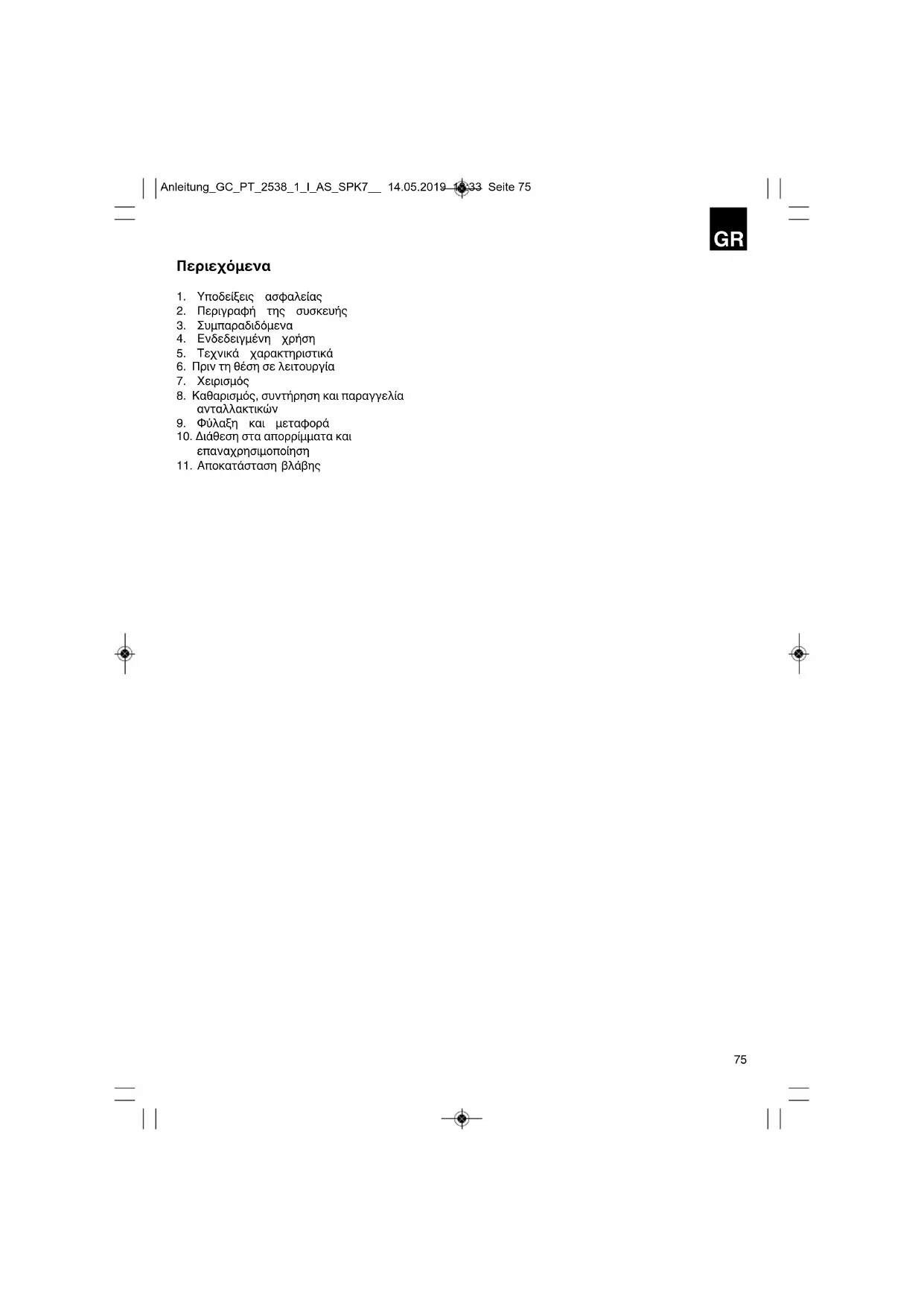Anleitung_GC_PT_2538_1_I_AS_SPK7__ 14.05.2019 13:33 Seite 75m Προσοχή! Κατά τη χρήση των συσκευών πρέπει, προς αποφυγή τραυματισμών, να τηρούνται και να λαμβάνονται ορισμένα μέτρα ασφαλείας. Διαβάστε για το λόγο αυτό προσεκτικά τις Οδηγίες χρήσης / Υποδείξεις ασφαλείας. Φυλάξτε τις καλά για να έχετε τις πληροφορίες πάντα στη διάθεσή σας. Εάν παραδώσετε τη συσκευή σε άλλα άτομα, δώστε μαζί και αυτές τις Οδηγίες χρήσης / Υποδείξεις ασφαλείας. Δεν αναλαμβάνουμε καμία ευθύνη για ατυχήματα ή βλάβες που οφείλονται σε μη τήρηση αυτών των Οδηγιών χρήσης και των Υποδείξεων