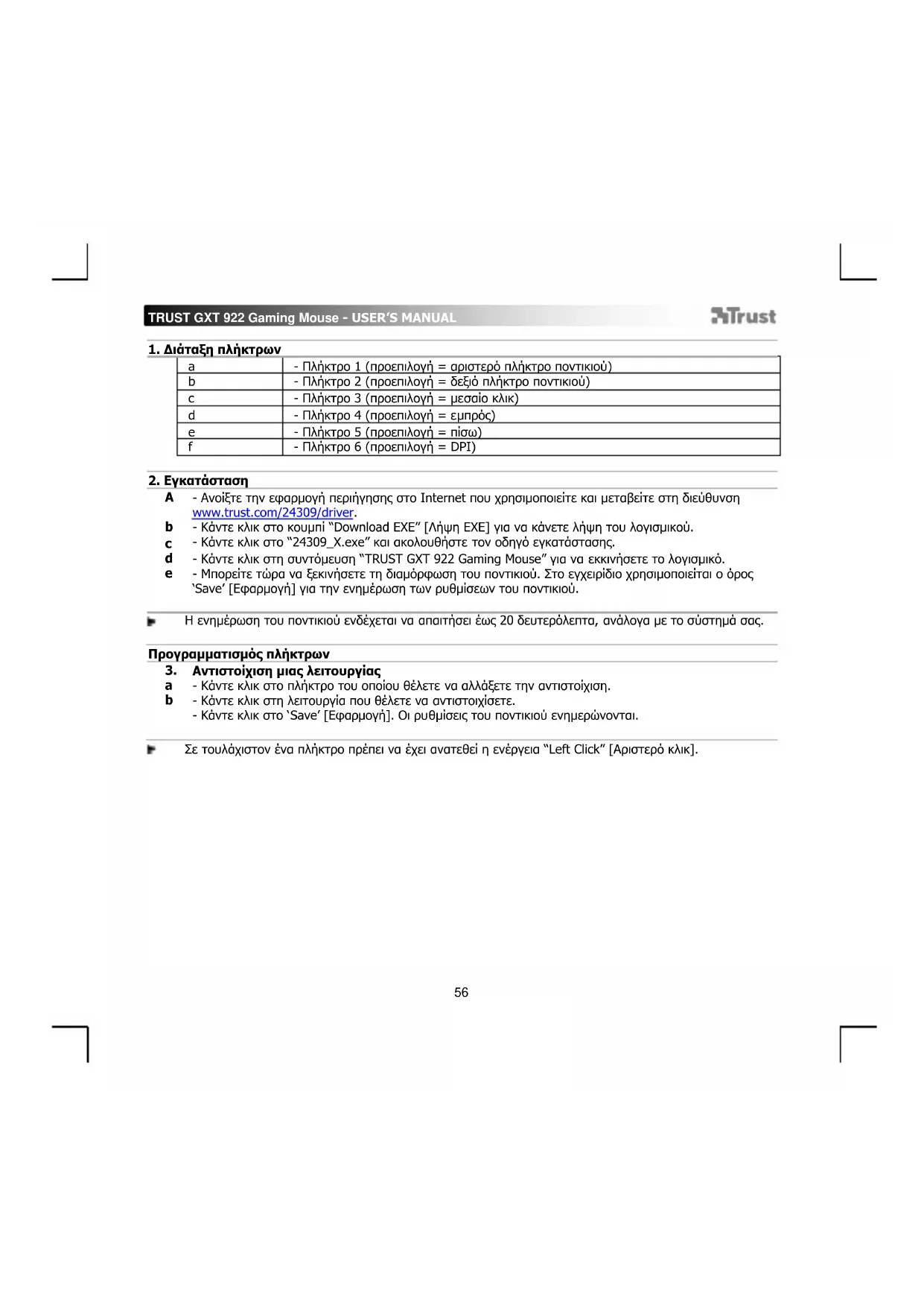 - Ανοίξτε την εφαρμογή περιήγησης στο Internet που χρησιμοποιείτε και μεταβείτε στη διεύθυνση www.trust.com/24309/driver. - Κάντε κλικ στο κουμπί “Download EXE” [Λήψη EXE] για να κάνετε λήψη του λογισμικού. - Κάντε κλικ στο “24309_X.exe” και ακολουθήστε τον οδηγό εγκατάστασης. - Κάντε κλικ στη συντόμευση “TRUST GXT 922 Gaming Mouse” για να εκκινήσετε το λογισμικό. - Μπορείτε τώρα να ξεκινήσετε τη διαμόρφωση του ποντικιού. Στο εγχειρίδιο χρησιμοποιείται ο όρος ‘Save’ [Εφαρμογή] για την ενημέρωση των ρυθμίσεων του ποντικιού. Η ενημέρωση του ποντικιού ενδέχεται να απαιτήσει έως 20 δευτερόλεπτα, ανάλογα με το σύστημά σας. Προγραμματισμός πλήκτρων