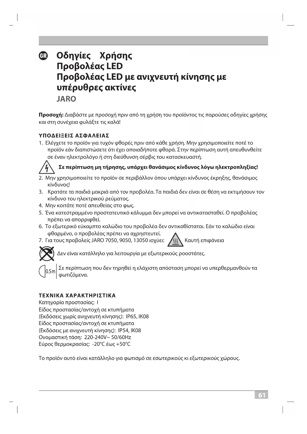 Καυτή επιφάνεια Δεν είναι κατάλληλο για λειτουργία με εξωτερικούς ροοστάτες. Σε περίπτωση που δεν τηρηθεί η ελάχιστη απόσταση μπορεί να υπερθερμανθούν τα φωτιζόμενα. ΤΕΧΝΙΚΑ ΧΑΡΑΚΤΗΡΙΣΤΙΚΑ Κατηγορία προστασίας: I Είδος προστασίας/αντοχή σε κτυπήματα (Εκδόσεις χωρίς ανιχνευτή κίνησης): IP65, IK08 Είδος προστασίας/αντοχή σε κτυπήματα (Εκδόσεις με ανιχνευτή κίνησης): IP54, IK08 Ονομαστική τάση: 220-240V~ 50/60Hz Εύρος θερμοκρασίας: -20°C έως +50°C Το προϊόν αυτό είναι κατάλληλο για φωτισμό σε εσωτερικούς κι εξωτερικούς χώρους. 20P114 LED Strahler Jaro PIR 0533228 210327.indd 61 27.03.2021 16:10:526262 Οδηγίες Χρήσης JARO ΣΥΝΑΡΜΟΛΟΓΗΣΗ ΚΑΙ ΣΥΝΔΕΣΗ ΣΤΗΝ ΤΡΟΦΟΔΟΣΙΑ ΡΕΥΜΑΤΟΣ 10 – 50 W βλέπε εικόνες στις σελίδες 4, 7 και 8