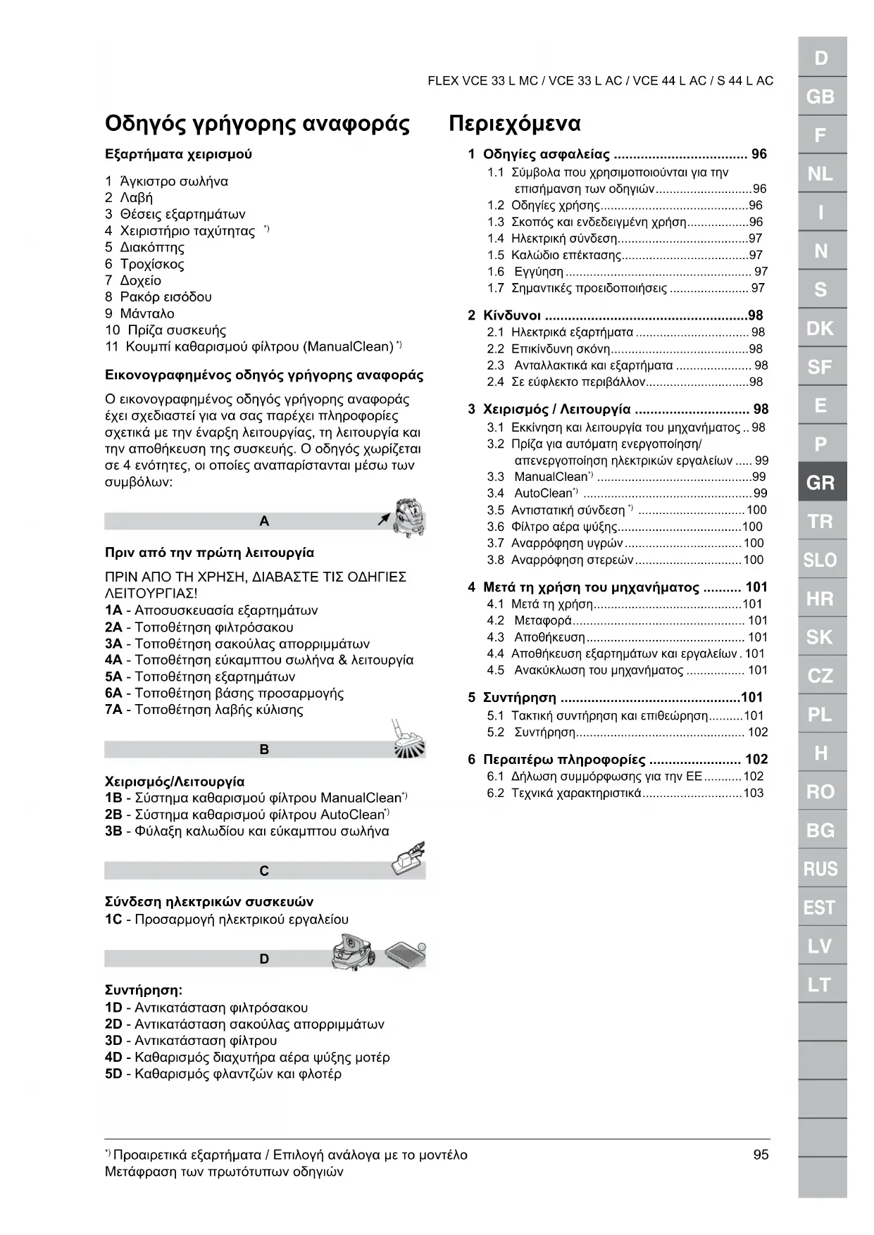FLEX VCE 33 L MC / VCE 33 L AC / VCE 44 L AC / S 44 L AC 1 Οδηγίες ασφαλείας Το παρόν έντυπο περιέχει σημαντικές οδηγίες ασφά- λειας για τη συσκευή και έναν εικονογραφημένο οδηγό γρήγορης αναφοράς. Προτού θέσετε τη συ- σκευή σας για πρώτη φορά σε λειτουργία, πρέπει να διαβάσετε προσεκτικά το παρόν εγχειρίδιο οδηγιών. Φυλάξτε τις οδηγίες για μελλοντική χρήση. Περαιτέρω υποστήριξη Μπορείτε να βρείτε περισσότερες πληροφορίες σχε- τικά με τη συσκευή στον ιστότοπό μας, στη διεύθυν- ση www.flex-tools.com. Για περαιτέρω ερωτήσεις, απευθυνθείτε στον αρμό- διο αντιπρόσωπο σέρβις της Flex στη χώρα σας. Ανατρέξτε στο οπισθόφυλλο αυτού του εντύπου.