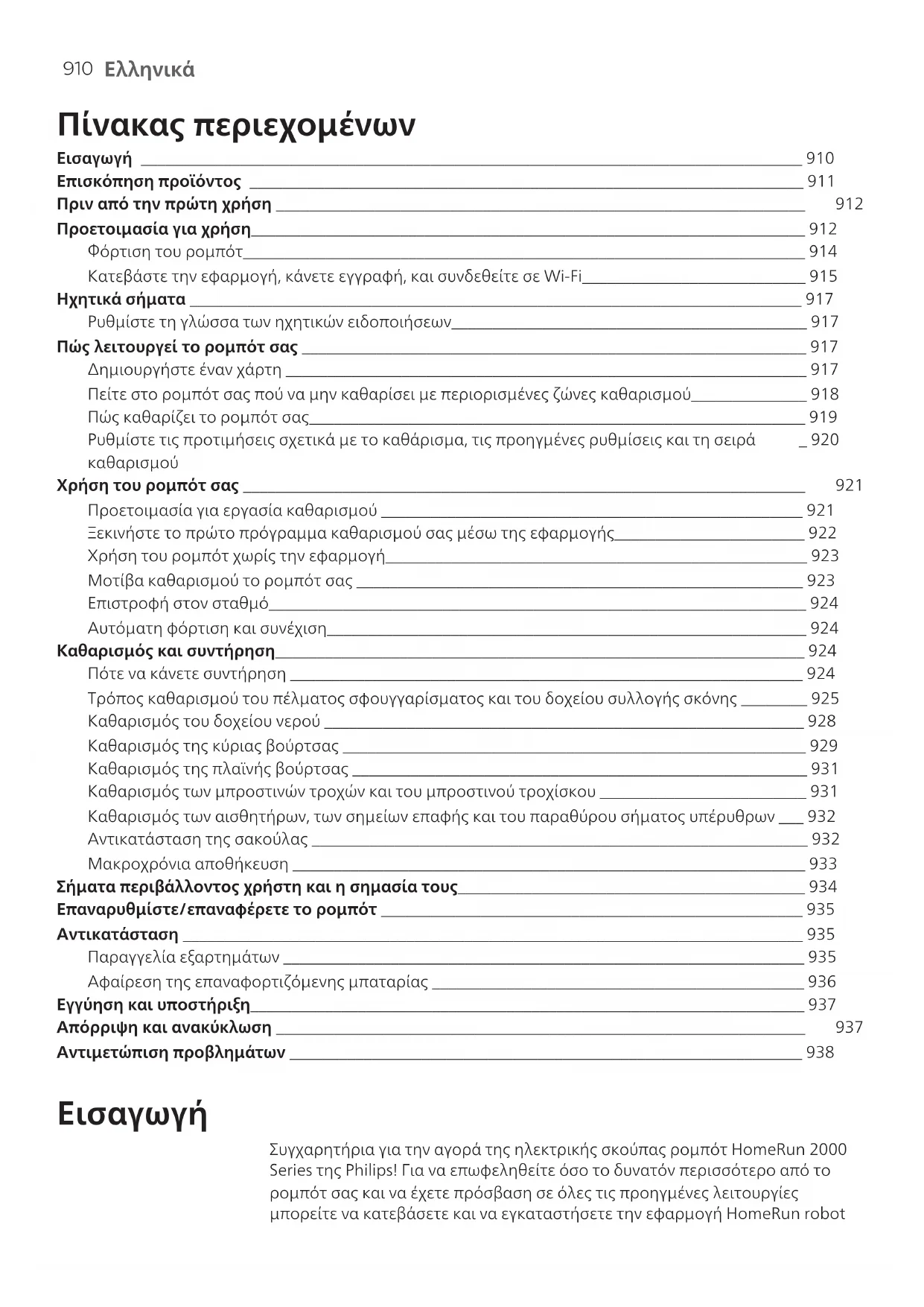 Πίνακας περιεχομένων Εισαγωγή ________________________________________________________________________________ 910 Επισκόπηση προϊόντος ___________________________________________________________________ 911 Πριν από την πρώτη χρήση ________________________________________________________________ 912 Προετοιμασία για χρήση___________________________________________________________________ 912 Φόρτιση του ρομπότ____________________________________________________________________ 914 Κατεβάστε την εφαρμογή, κάνετε εγγραφή, και συνδεθείτε σε Wi-Fi___________________________ 915 Ηχητικά σήματα __________________________________________________________________________ 917 Ρυθμίστε τη γλώσσα των ηχητικών ειδοποιήσεων___________________________________________ 917 Πώς λειτουργεί το ρομπότ σας _____________________________________________________________ 917 Δημιουργήστε έναν χάρτη _______________________________________________________________ 917 Πείτε στο ρομπότ σας πού να μην καθαρίσει με περιορισμένες ζώνες καθαρισμού______________ 918 Πώς καθαρίζει το ρομπότ σας____________________________________________________________ 919 Ρυθμίστε τις προτιμήσεις σχετικά με το καθάρισμα, τις προηγμένες ρυθμίσεις και τη σειρά