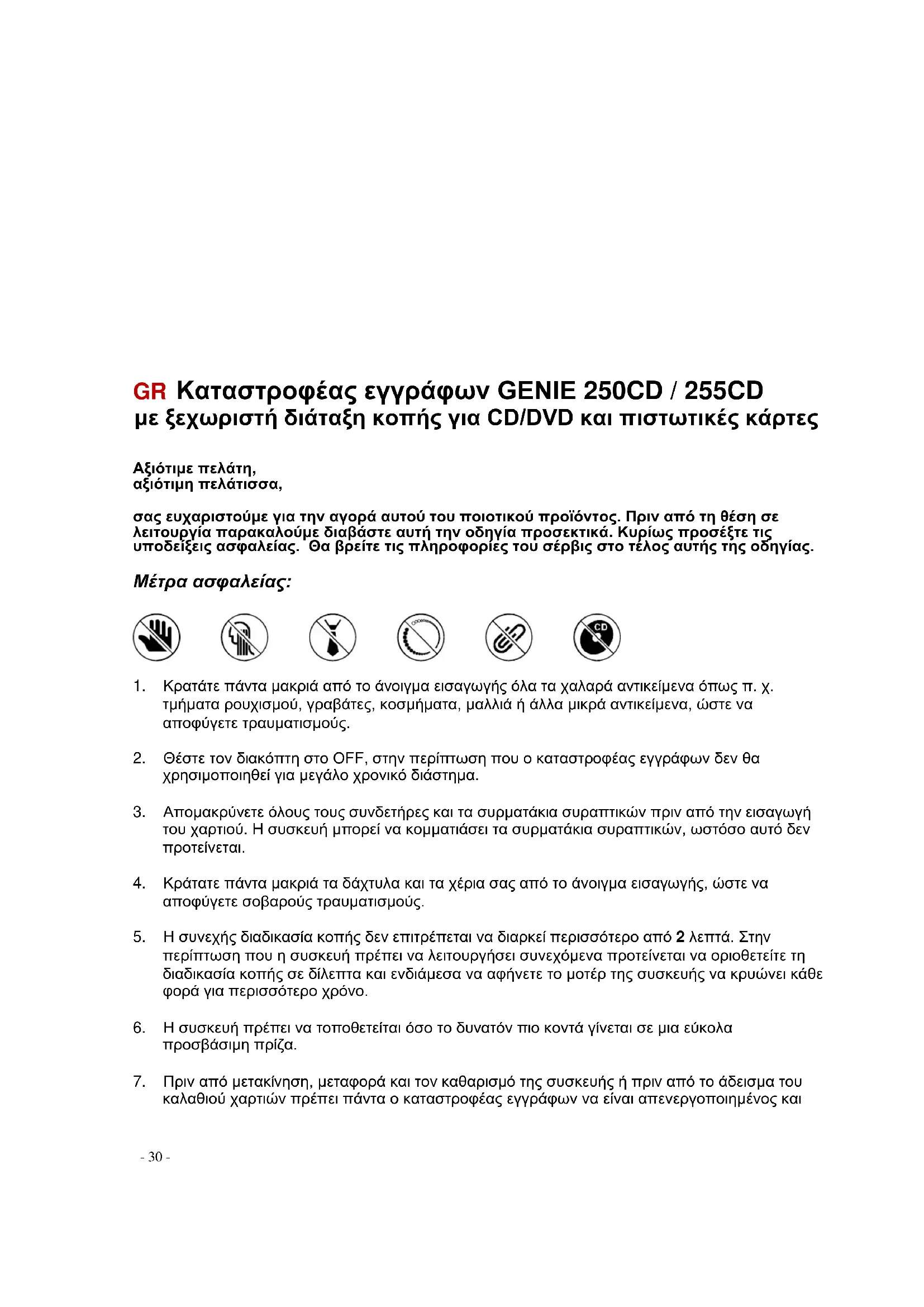 ΔΙΑΔΙΚΑΣΙΑ ΕΓΓΥΗΣΗΣ Ευχαριστούμε για την αγορά αυτού του προϊόντος GENIE. Εάν αυτή η συσκευή παρά τα αναμενόμενα δεν λειτουργεί άψογα, παρακαλούμε προσέξτε τα ακόλουθα: Ο χρόνος εγγύησης ανέρχεται σε σωστή χρήση στους 36 μήνες από την ημερομηνία αγοράς. Παρακαλούμε φυλάτε την απόδειξη αγοράς και την αρχική συσκευασία. Η απόδοση εγγύησης ισχύει μόνο για σφάλματα υλικού ή κατασκευής, όχι όμως για βλάβες σε ευαίσθητα εξαρτήματα π.χ. στην επικάλυψη. Συσκευές οι οποίες έχουν φθαρεί εξωτερικά από ακατάλληλη χρήση, αποκλείονται από αλλαγή. Η εγγύηση λήγει όταν έχουν διεξαχθεί επισκευές χωρίς επίσημη ρητή έγκριση του τμήματος εξυπηρέτησης πελατών. Οι επισκευές εντός εγγύησης μπορούν να γίνουν μόνο με συνημμένη απόδειξη αγοράς - κάθε επιστροφή πρέπει να ανακοινώνεται τηλεφωνικά! Μπορούν να ληφθούν μόνο επιστροφές οι οποίες έχουν πληρωμένα ταχυδρομικά τέλη με αντίστοιχο αριθμό επιστροφής. Παρακαλούμε αναφέρετε πάντα όνομα, οδό, Τ.Κ., περιοχή κατοικίας και τηλέφωνο με κωδικό περιοχής και την αιτία του παραπόνου σας. Ευχαριστούμε πολύ για την κατανόηση σας! Γραμμή εξυπηρέτησης σέρβις: Τηλ. +49 (0) 61 22-72 79 89 1 ● Φαξ +49 () 61 22-70 59 52 ●Ηλεκτρονική διεύθυνση: hotline@genie-online.de Θα στέλνετε όλες τις επιστροφές κατόπιν επιτυχούς ενημέρωσης με πληρωμένα ταχυδρομικά τέλη στην ακόλουθη διεύθυνση: Dieter Gerth GmbH, -Service- , Berta-Cramer-Ring 22, D-65205 Wiesbaden. Deutschland/Gemany- 34 - Κατευθυντήρια γραμμή 2002/96/Ε.Ε. για την μεταχείριση, συλλογή, ανακύκλωση και απομάκρυνση ηλεκτρικών και ηλεκτρονικών συσκευών και των εξαρτημάτων τους (waste electrical and electronic equipment –WEEE). Το διαγραμμισμένο σύμβολο ενός κάδου απορριμμάτων υποδεικνύει ότι η συσκευή δεν επιτρέπεται να απομακρυνθεί στα οικιακά απορρίμματα, αλλά πρέπει να παραδοθεί στα για αυτή εξοπλισμένα κέντρα συλλογής για την σωστή ανακύκλωση ή απόρριψη. Αυτή η συσκευή αντιστοιχεί στις απαιτήσεις σύμφωνα με την Κατευθυντήρια γραμμή Ε.Ε. 89/336/ΕΟΚ "Ηλεκτρομαγνητική συμβατότητα" και 73/23/ΕΟΚ "Κατευθυντήρια γραμμή περί χαμηλής τάσης". PL GENIE 250CD / 255CD Niszczarka dokumentów z osobnym mechanizmem tnącym dla płyt CD/DVD i kart kredytowych Szanowni Państwo,