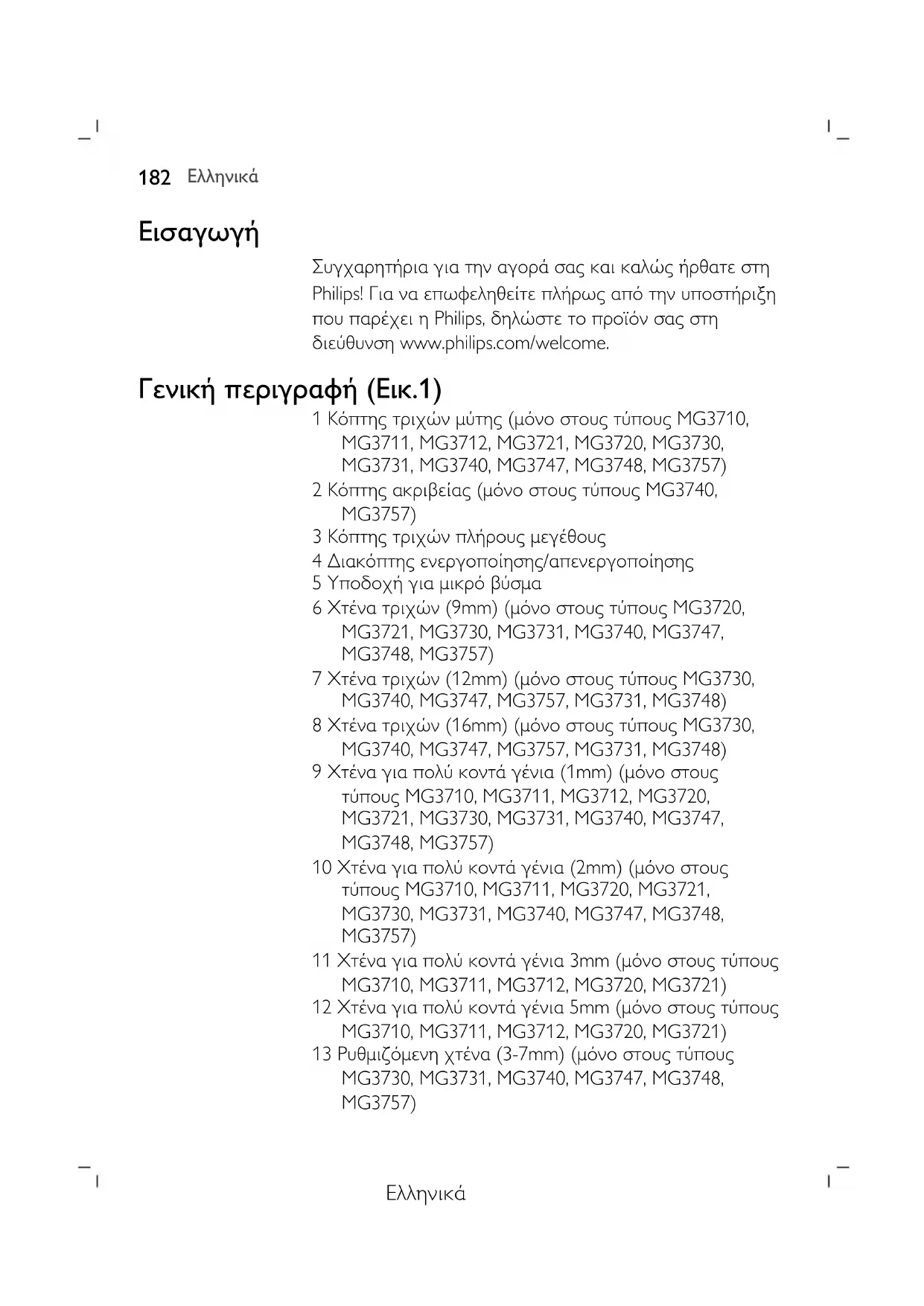 Συγχαρητήρια για την αγορά σας και καλώς ήρθατε στη Philips! Για να επωφεληθείτε πλήρως από την υποστήριξη που παρέχει η Philips, δηλώστε το προϊόν σας στη διεύθυνση www.philips.com/welcome. Γενική περιγραφή (Εικ.1) 1 Κόπτης τριχών μύτης (μόνο στους τύπους MG3710, MG3711, MG3712, MG3721, MG3720, MG3730, MG3731, MG3740, MG3747, MG3748, MG3757) 2 Κόπτης ακριβείας (μόνο στους τύπους MG3740, MG3757) 3 Κόπτης τριχών πλήρους μεγέθους 4 Διακόπτης ενεργοποίησης/απενεργοποίησης 5 Υποδοχή για μικρό βύσμα 6 Χτένα τριχών (9mm) (μόνο στους τύπους MG3720, MG3721, MG3730, MG3731, MG3740, MG3747, MG3748, MG3757) 7 Χτένα τριχών (12mm) (μόνο στους τύπους MG3730, MG3740, MG3747, MG3757, MG3731, MG3748) 8 Χτένα τριχών (16mm) (μόνο στους τύπους MG3730, MG3740, MG3747, MG3757, MG3731, MG3748) 9 Χτένα για πολύ κοντά γένια (1mm) (μόνο στους τύπους MG3710, MG3711, MG3712, MG3720, MG3721, MG3730, MG3731, MG3740, MG3747, MG3748, MG3757) 10 Χτένα για πολύ κοντά γένια (2mm) (μόνο στους τύπους MG3710, MG3711, MG3720, MG3721, MG3730, MG3731, MG3740, MG3747, MG3748, MG3757) 11 Χτένα για πολύ κοντά γένια 3mm (μόνο στους τύπους MG3710, MG3711, MG3712, MG3720, MG3721) 12 Χτένα για πολύ κοντά γένια 5mm (μόνο στους τύπους MG3710, MG3711, MG3712, MG3720, MG3721) 13 Ρυθμιζόμενη χτένα (3-7mm) (μόνο στους τύπους MG3730, MG3731, MG3740, MG3747, MG3748, MG3757)