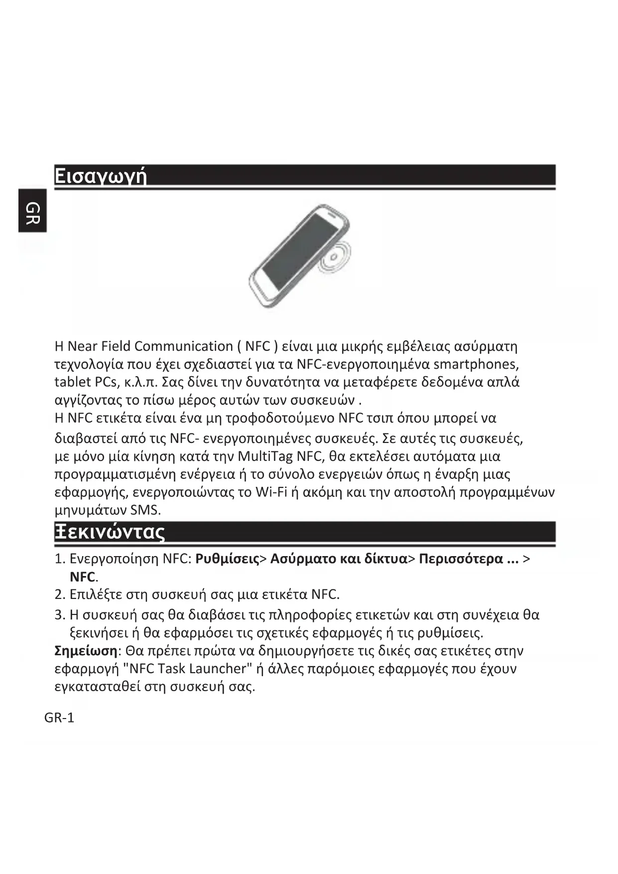 ξεκινήσει ή θα εφαρμόσει τις σχετικές εφαρμογές ή τις ρυθμίσεις. Σημείωση: Θα πρέπει πρώτα να δημιουργήσετε τις δικές σας ετικέτες στην εφαρμογή "NFC Task Launcher" ή άλλες παρόμοιες εφαρμογές που έχουν εγκατασταθεί στη συσκευή σας.GR GR-2 Παραδείγματα Παράδειγμα 1 Λειτουργία Κομοδίνου Στην εφαρμογή "NFC Task Launcher», προγραμματίστε μια ενέργεια σε μια ετικέτα για τη λειτουργία κομοδίνου (σε αθόρυβη λειτουργία, ανοίγοντας την εφαρμογή ρολογιού για το κομοδίνο, ρύθμιση του συναγερμού, μετατρέποντας τα ανοικτά Wi-Fi δίκτυα και ούτω καθεξής). Αγγίζοντας την ετικέτα NFC, μπορείτε να βάλετε γρήγορα το τηλέφωνό σας σε επιτραπέζια λειτουργία. Παράδειγμα 2 Λειτουργία σπιτιού Προγραμματίστε μια ενέργεια σε μια ετικέτα NFC για να ενεργοποιήσετε το δίκτυο Wi-Fi, να απενεργοποιήστε το GPS και να το κολλήσετε κοντά στηνGR-3