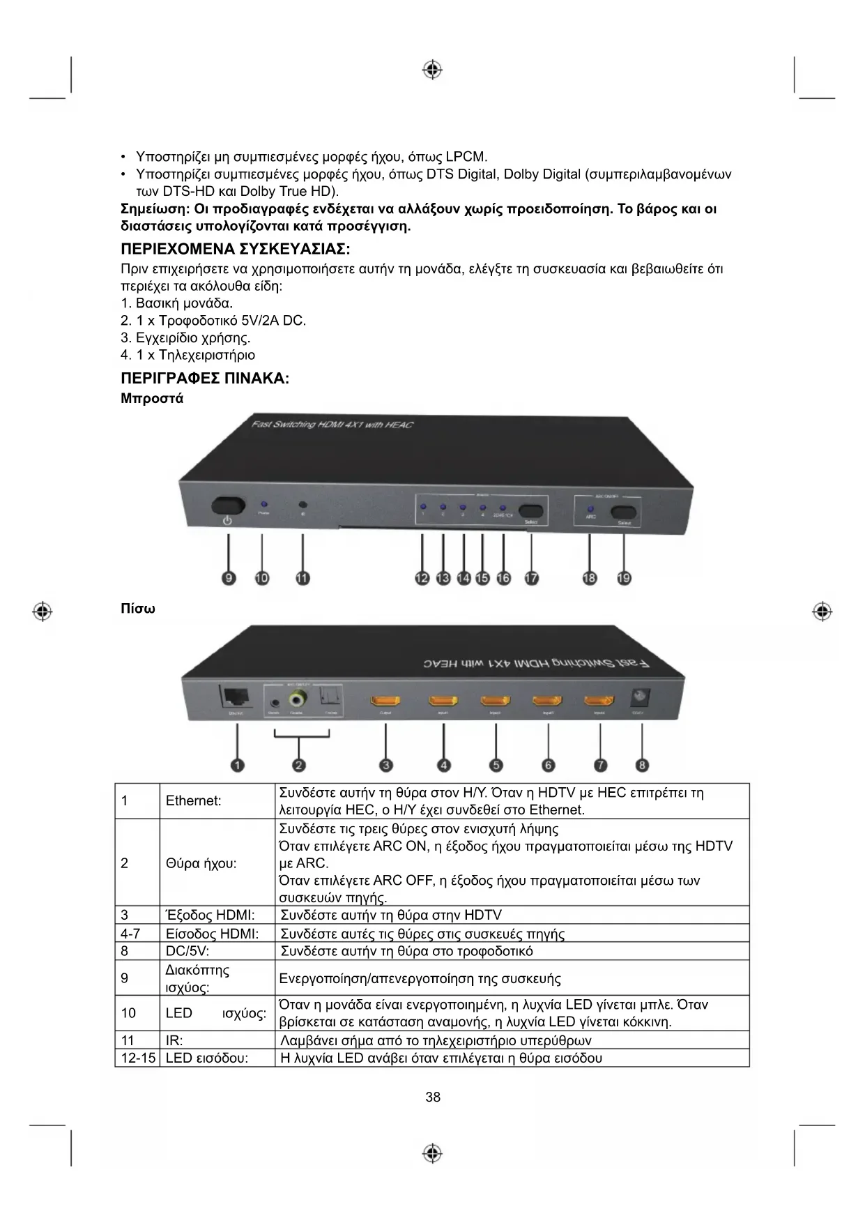 1 Ethernet: Συνδέστε αυτήν τη θύρα στον Η/Υ. Όταν η HDTV με HEC επιτρέπει τη λειτουργία HEC, ο Η/Υ έχει συνδεθεί στο Ethernet. 2 Θύρα ήχου: Συνδέστε τις τρεις θύρες στον ενισχυτή λήψης Όταν επιλέγετε ARC ON, η έξοδος ήχου πραγματοποιείται μέσω της HDTV με ARC. Όταν επιλέγετε ARC OFF, η έξοδος ήχου πραγματοποιείται μέσω των συσκευών πηγής. 3 Έξοδος HDMI: Συνδέστε αυτήν τη θύρα στην HDTV 4-7 Είσοδος HDMI: Συνδέστε αυτές τις θύρες στις συσκευές πηγής 8 DC/5V: Συνδέστε αυτήν τη θύρα στο τροφοδοτικό