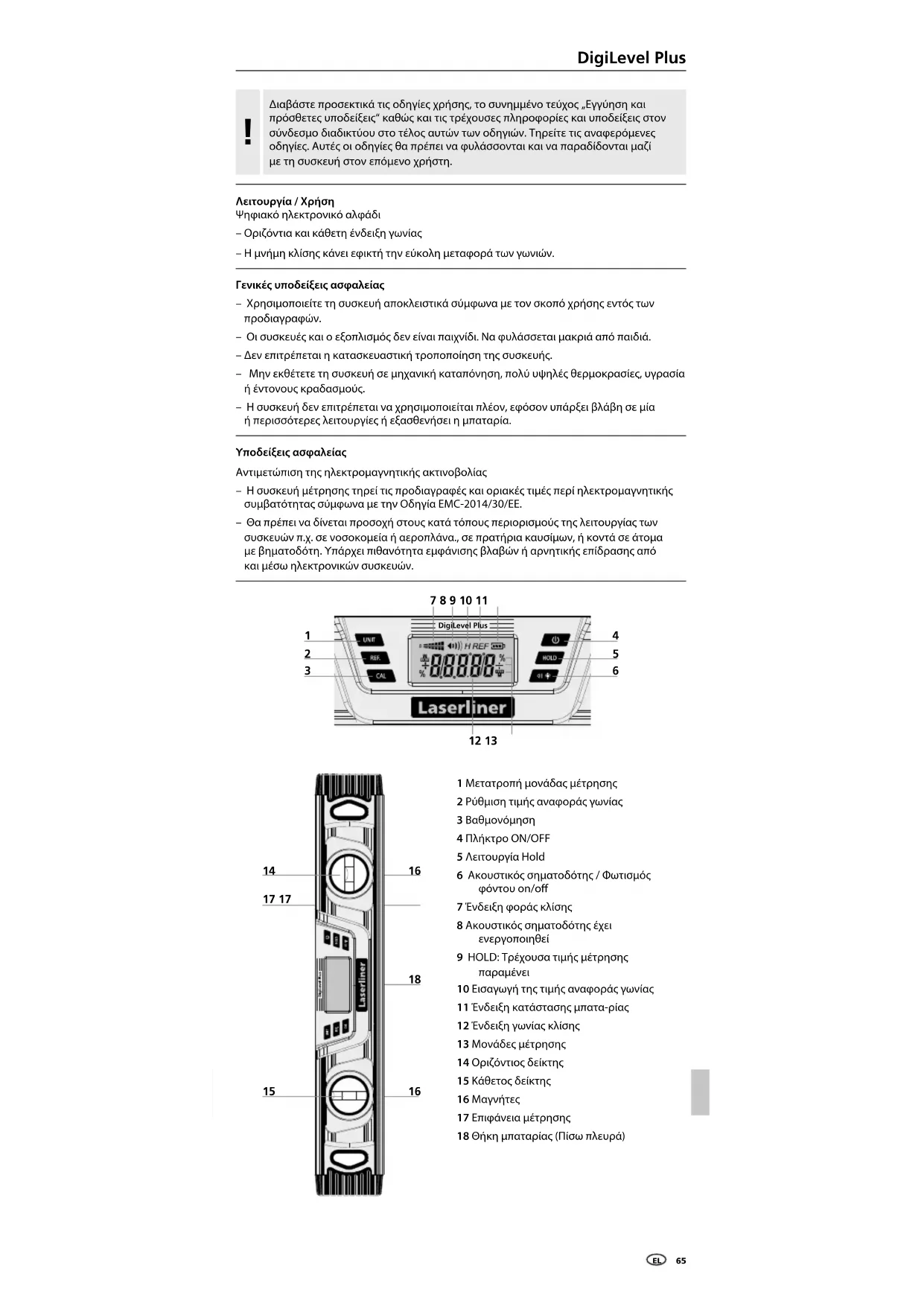 Λειτουργία / Χρήση Ψηφιακό ηλεκτρονικό αλφάδι – Οριζόντια και κάθετη ένδειξη γωνίας – Η μνήμη κλίσης κάνει εφικτή την εύκολη μεταφορά των γωνιών. Γενικές υποδείξεις ασφαλείας – Χρησιμοποιείτε τη συσκευή αποκλειστικά σύμφωνα με τον σκοπό χρήσης εντός των προδιαγραφών. – Οι συσκευές και ο εξοπλισμός δεν είναι παιχνίδι. Να φυλάσσεται μακριά από παιδιά. – Δεν επιτρέπεται η κατασκευαστική τροποποίηση της συσκευής. – Μην εκθέτετε τη συσκευή σε μηχανική καταπόνηση, πολύ υψηλές θερμοκρασίες, υγρασία ή έντονους κραδασμούς. – Η συσκευή δεν επιτρέπεται να χρησιμοποιείται πλέον, εφόσον υπάρξει βλάβη σε μία ή περισσότερες λειτουργίες ή εξασθενήσει η μπαταρία. Υποδείξεις ασφαλείας Αντιμετώπιση της ηλεκτρομαγνητικής ακτινοβολίας – Η συσκευή μέτρησης τηρεί τις προδιαγραφές και οριακές τιμές περί ηλεκτρομαγνητικής συμβατότητας σύμφωνα με την Οδηγία EMC-2014/30/EΕ. – Θα πρέπει να δίνεται προσοχή στους κατά τόπους περιορισμούς της λειτουργίας των συσκευών π.χ. σε νοσοκομεία ή αεροπλάνα., σε πρατήρια καυσίμων, ή κοντά σε άτομα με βηματοδότη. Υπάρχει πιθανότητα εμφάνισης βλαβών ή αρνητικής επίδρασης από και μέσω ηλεκτρονικών συσκευών. DigiLevel Plus