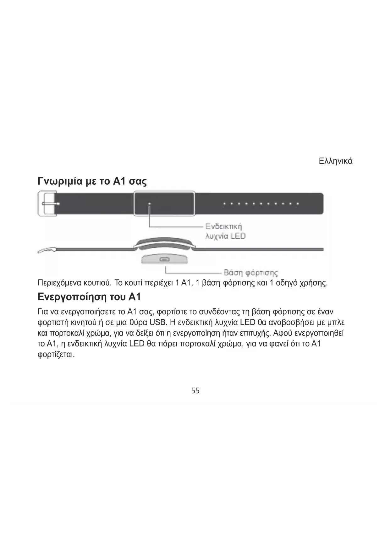 Γνωριμία με το Α1 σας Περιεχόμενα κουτιού. Το κουτί περιέχει 1 Α1, 1 βάση φόρτισης και 1 οδηγό χρήσης. Ενεργοποίηση του Α1 Για να ενεργοποιήσετε το Α1 σας, φορτίστε το συνδέοντας τη βάση φόρτισης σε έναν φορτιστή κινητού ή σε μια θύρα USB. Η ενδεικτική λυχνία LED θα αναβοσβήσει με μπλε και πορτοκαλί χρώμα, για να δείξει ότι η ενεργοποίηση ήταν επιτυχής. Αφού ενεργοποιηθεί το Α1, η ενδεικτική λυχνία LED θα πάρει πορτοκαλί χρώμα, για να φανεί ότι το Α1 φορτίζεται.Ελληνικά