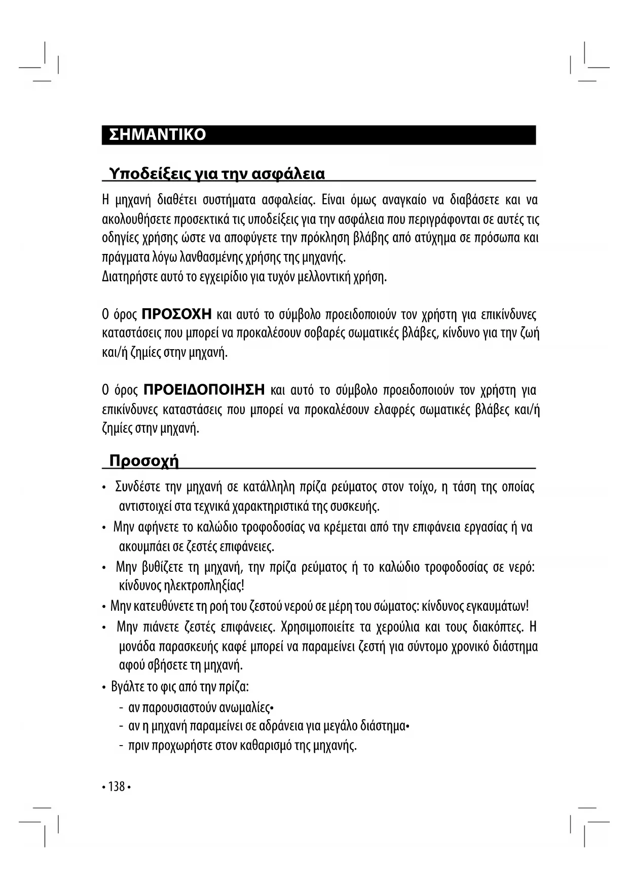 Υποδείξεις για την ασφάλεια Η μηχανή διαθέτει συστήματα ασφαλείας. Είναι όμως αναγκαίο να διαβάσετε και να ακολουθήσετε προσεκτικά τις υποδείξεις για την ασφάλεια που περιγράφονται σε αυτές τις οδηγίες χρήσης ώστε να αποφύγετε την πρόκληση βλάβης από ατύχημα σε πρόσωπα και πράγματα λόγω λανθασμένης χρήσης της μηχανής. Διατηρήστε αυτό το εγχειρίδιο για τυχόν μελλοντική χρήση. Ο όρος ΠΡΟΣΟΧΗ και αυτό το σύμβολο προειδοποιούν τον χρήστη για επικίνδυνες καταστάσεις που μπορεί να προκαλέσουν σοβαρές σωματικές βλάβες, κίνδυνο για την ζωή και/ή ζημίες στην μηχανή. Ο όρος ΠΡΟΕΙΔΟΠΟΙΗΣΗ και αυτό το σύμβολο προειδοποιούν τον χρήστη για επικίνδυνες καταστάσεις που μπορεί να προκαλέσουν ελαφρές σωματικές βλάβες και/ή ζημίες στην μηχανή.