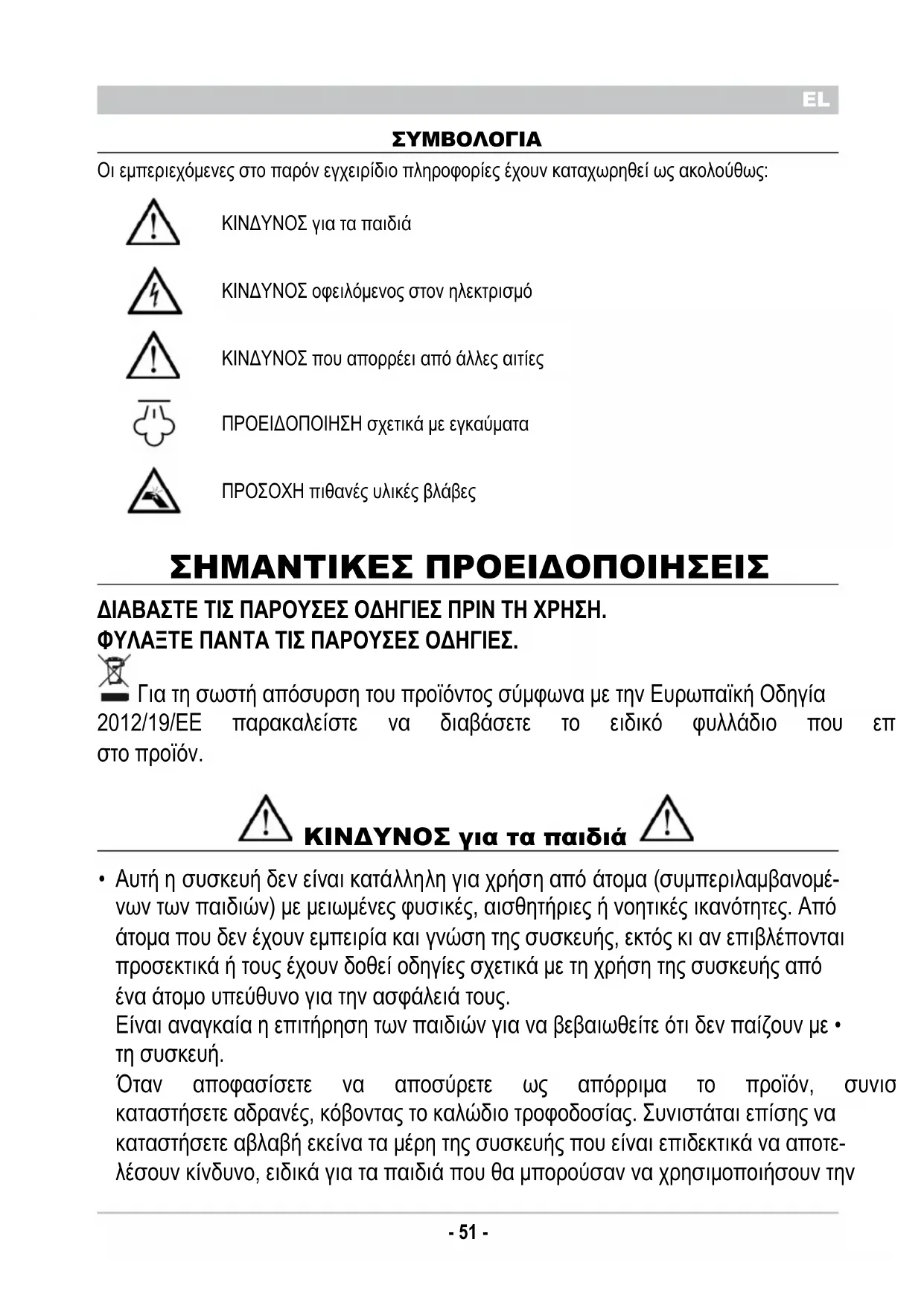 Οιεμπεριεχόμενεςστοπαρόνεγχειρίδιοπληροφορίεςέχουνκαταχωρηθείωςακολούθως: ΚΙΝΔΥΝΟΣγιαταπαιδιά ΚΙΝΔΥΝΟΣοφειλόμενοςστονηλεκτρισμό ΚΙΝΔΥΝΟΣπουαπορρέειαπόάλλεςαιτίες ΠΡΟΕΙΔΟΠΟΙΗΣΗσχετικάμεεγκαύματα ΠΡΟΣΟΧΗπιθανέςυλικέςβλάβες ΣΗΜΑΝΤΙΚΕΣ ΠΡΟΕΙΔΟΠΟΙΗΣΕΙΣ ΔΙαΒαΣΤΕ ΤΙΣ ΠαΡΟΥΣΕΣ ΟΔΗΓΙΕΣ ΠΡΙΝ ΤΗ ΧΡΗΣΗ. ΦΥΛαΞΤΕ ΠαΝΤα ΤΙΣ ΠαΡΟΥΣΕΣ ΟΔΗΓΙΕΣ. ΓιατησωστήαπόσυρσητουπροϊόντοςσύμφωναμετηνΕυρωπαϊκήΟδηγία 2012/19/EΕ παρακαλείστε να διαβάσετε το ειδικό φυλλάδιο που επισυνάπτεται