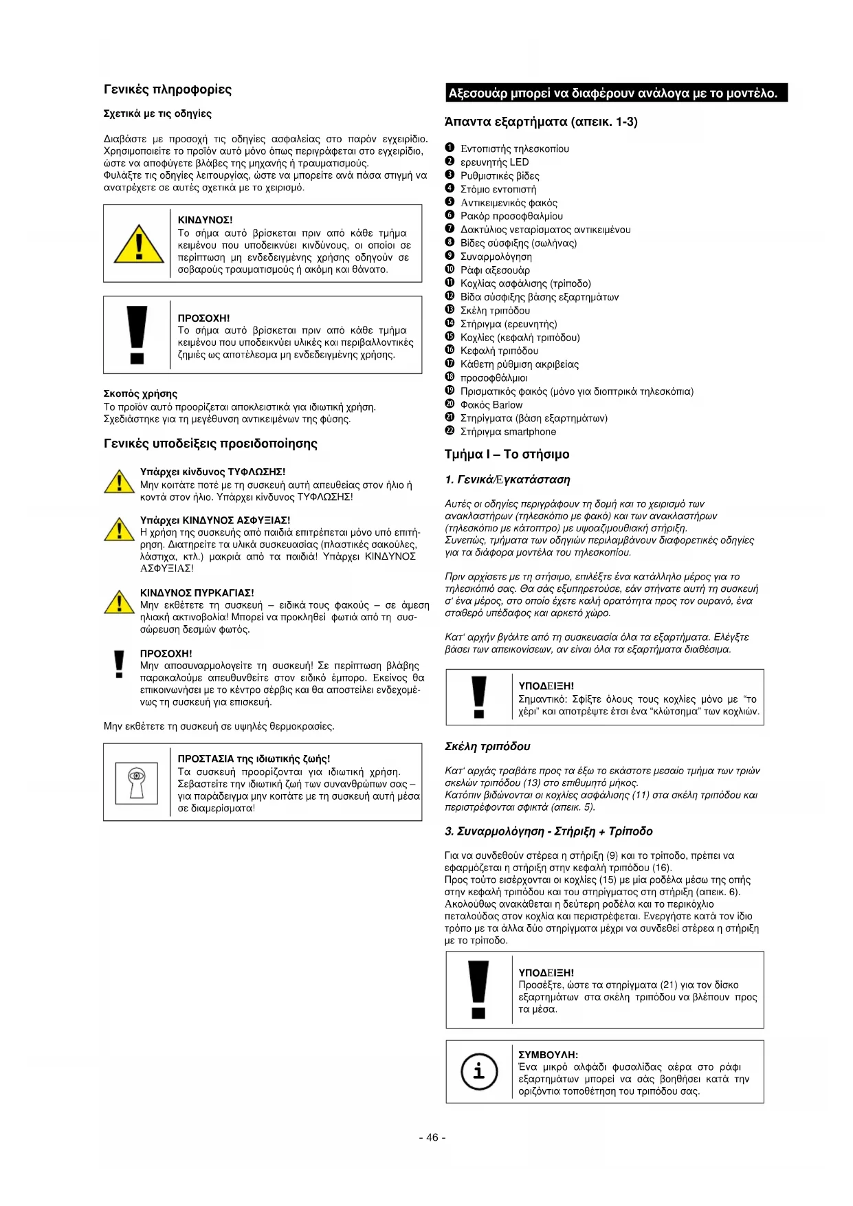 Αυτές οι οδηγίες περιγράφουν τη δοµή και το χειρισµό των ανακλαστήρων (τηλεσκόπιο µε φακό) και των ανακλαστήρων (τηλεσκόπιο µε κάτοπτρο) µε υψοαζιµουθιακή στήριξη. Συνεπώς, τµήµατα των οδηγιών περιλαµβάνουν διαφορετικές οδηγίες για τα διάφορα µοντέλα του τηλεσκοπίου. Πριν αρχίσετε µε τη στήσιµο, επιλέξτε ένα κατάλληλο µέρος για το τηλεσκόπιό σας. Θα σάς εξυπηρετούσε, εάν στήνατε αυτή τη συσκευή σ‘ ένα µέρος, στο οποίο έχετε καλή ορατότητα προς τον ουρανό, ένα σταθερό υπέδαφος και αρκετό χώρο. Κατ‘ αρχήν βγάλτε από τη συσκευασία όλα τα εξαρτήµατα. Ελέγξτε βάσει των απεικονίσεων, αν είναι όλα τα εξαρτήµατα διαθέσιµα.