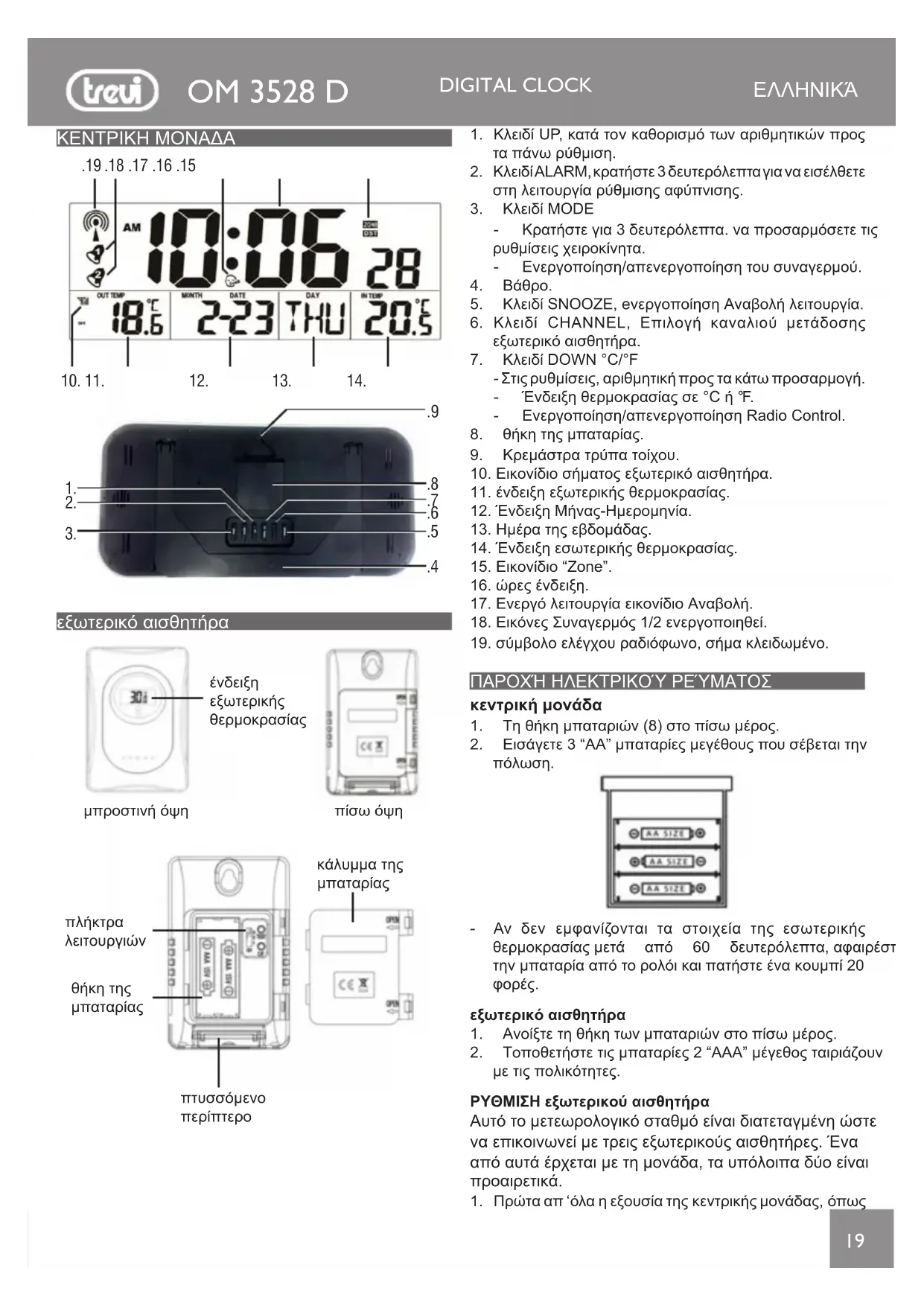 ΚΕΝΤΡΙΚΗΜΟΝΑΔΑ εξωτερικόαισθητήρα μπροστινήόψη πίσωόψηένδειξηεξωτερικήςθερμοκρασίαςκάλυμματηςμπαταρίαςθήκητηςμπαταρίαςπτυσσόμενοπερίπτεροπλήκτραλειτουργιών .6OM 3528 D DIGITAL CLOCK