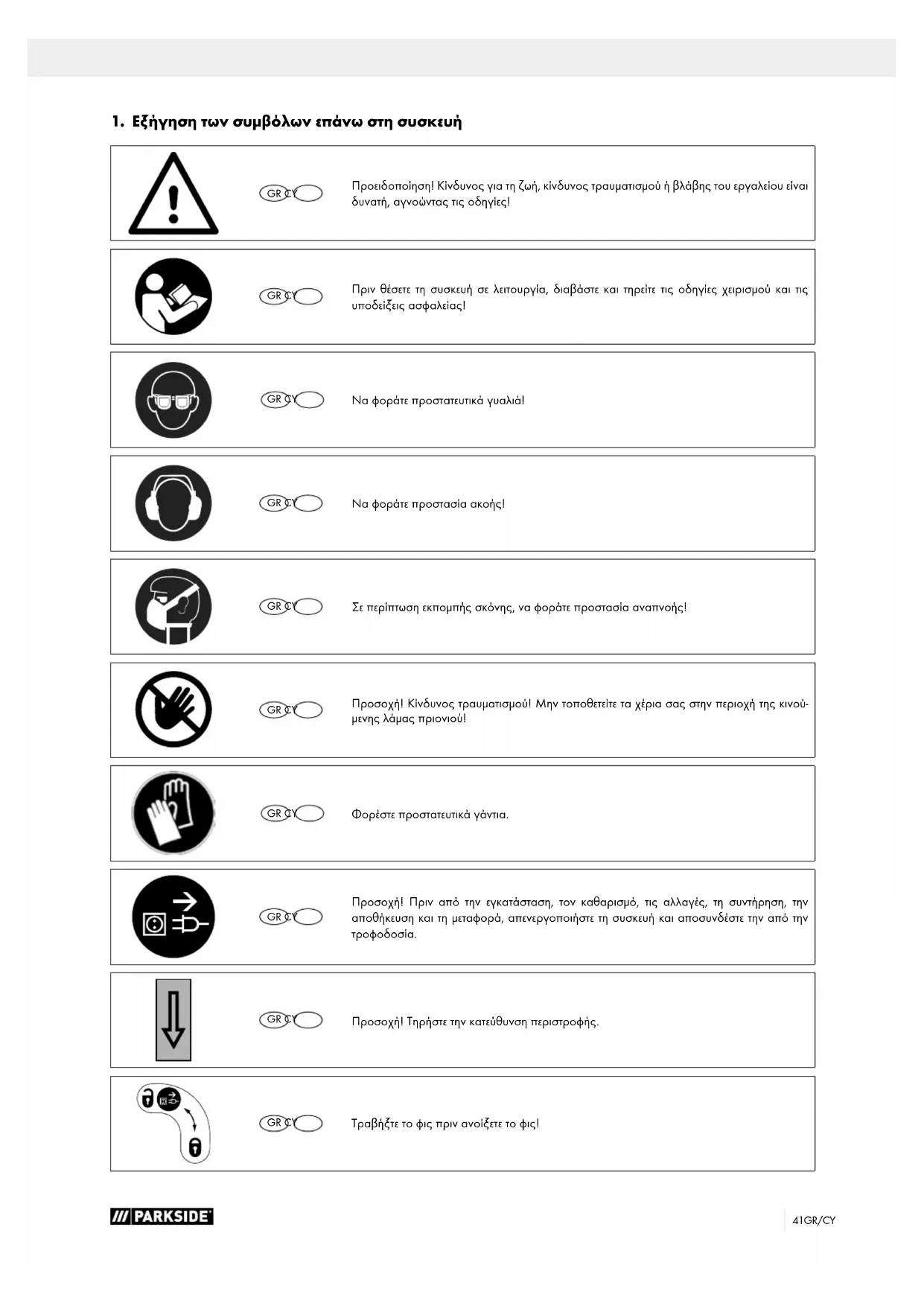 GR CY Προειδοποίηση! Κίνδυνος για τη ζωή, κίνδυνος τραυματισμού ή βλάβης του εργαλείου είναι δυνατή, αγνοώντας τις οδηγίες! GR CY Πριν θέσετε τη συσκευή σε λειτουργία, διαβάστε και τηρείτε τις οδηγίες χειρισμού και τις υποδείξεις ασφαλείας! GR CY Να φοράτε προστατευτικά γυαλιά! GR CY Να φοράτε προστασία ακοής! GR CY Σε περίπτωση εκπομπής σκόνης, να φοράτε προστασία αναπνοής! GR CY Προσοχή! Κίνδυνος τραυματισμού! Μην τοποθετείτε τα χέρια σας στην περιοχή της κινού- μενης λάμας πριονιού! GR CY Φορέστε προστατευτικά γάντια. GR CY Προσοχή! Πριν από την εγκατάσταση, τον καθαρισμό, τις αλλαγές, τη συντήρηση, την αποθήκευση και τη μεταφορά, απενεργοποιήστε τη συσκευή και αποσυνδέστε την από την τροφοδοσία. GR CY Προσοχή! Τηρήστε την κατεύθυνση περιστροφής. GR CY Τραβήξτε το φις πριν ανοίξετε το φις!42 GR/CY