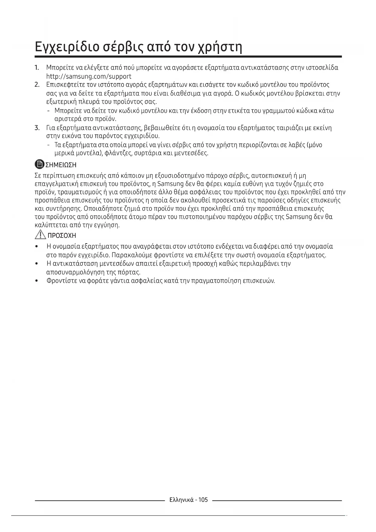 Σε περίπτωση επισκευής από κάποιον μη εξουσιοδοτημένο πάροχο σέρβις, αυτοεπισκευή ή μη επαγγελματική επισκευή του προϊόντος, η Samsung δεν θα φέρει καμία ευθύνη για τυχόν ζημιές στο προϊόν, τραυματισμούς ή για οποιοδήποτε άλλο θέμα ασφάλειας του προϊόντος που έχει προκληθεί από την προσπάθεια επισκευής του προϊόντος η οποία δεν ακολουθεί προσεκτικά τις παρούσες οδηγίες επισκευής και συντήρησης. Οποιαδήποτε ζημιά στο προϊόν που έχει προκληθεί από την προσπάθεια επισκευής του προϊόντος από οποιοδήποτε άτομο πέραν του πιστοποιημένου παρόχου σέρβις της Samsung δεν θα καλύπτεται από την εγγύηση.