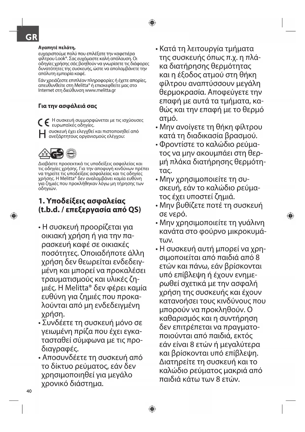 - Упаковкаможетбытьиспользованадляповторной переработки. Пожалуйста, берегите природу, и передайте упаковку для повторной переработки. RU40 Αγαπητέ πελάτη, ευχαριστούε πολύ που επιλέξατε την καφετιέρα φίλτρου Look®. Σα ευχόαστε καλή απόλαυση. Οι οδηγίε χρήση σά βοηθούν να γνωρίσετε τι διάφορε δυνατότητε τη συσκευή, ώστε να απολαβάνετε την απόλυτη επειρία καφέ. Εάν χρειάζεστε επιπλέον πληροφορίε ή έχετε απορίε, απευθυνθείτε στη Melitta® ή επισκεφθείτε α στο Internet στη διεύθυνση www.melitta.gr Για την ασφάλειά σας