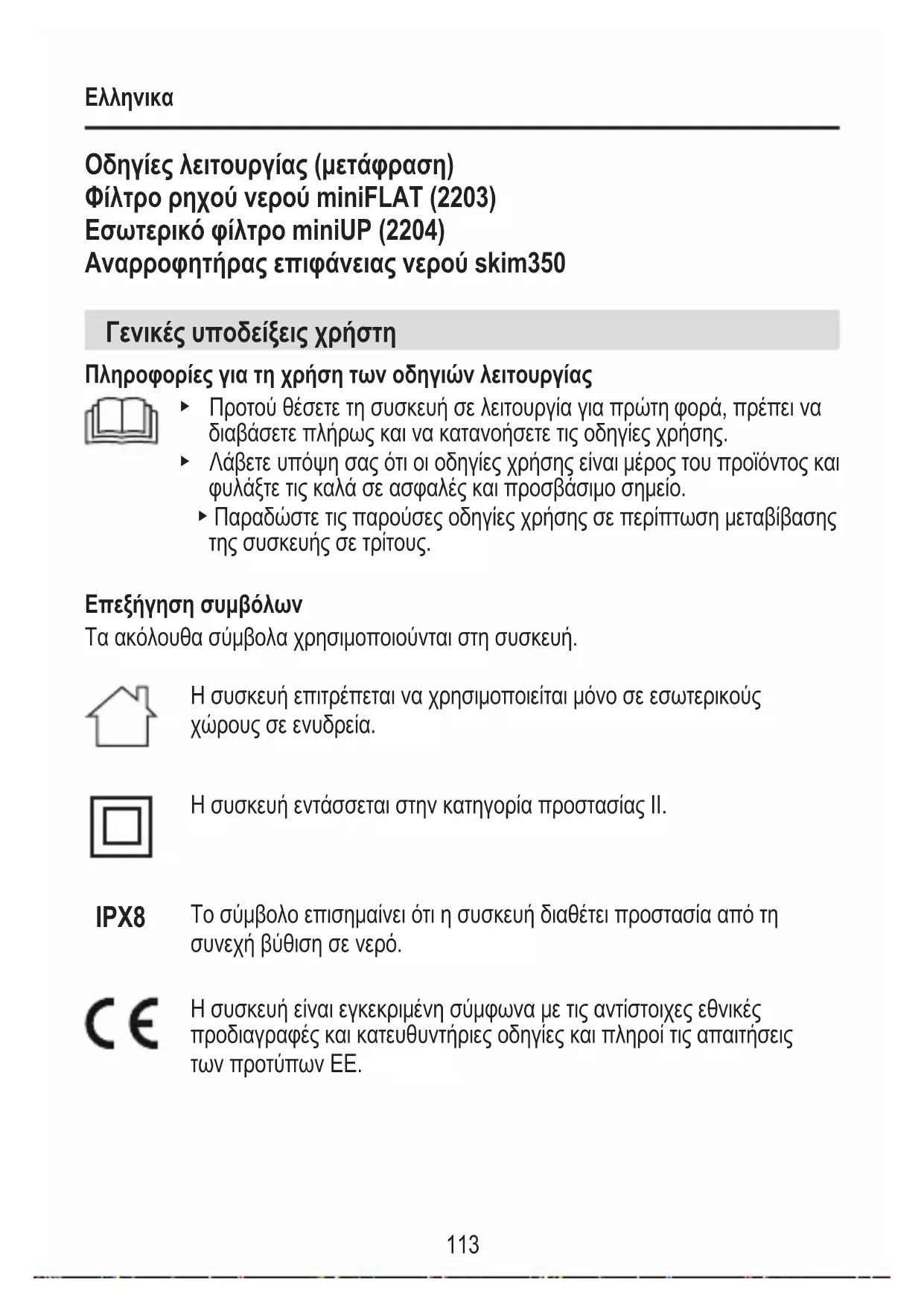 Οδηγίες λειτουργίας (μετάφραση) Φίλτρο ρηχού νερού miniFLAT (2203) Εσωτερικό φίλτρο miniUP (2204) Αναρροφητήρας επιφάνειας νερού skim350 Γενικές υποδείξεις χρήστη Πληροφορίες για τη χρήση των οδηγιών λειτουργίας ▶ Προτού θέσετε τη συσκευή σε λειτουργία για πρώτη φορά, πρέπει να διαβάσετε πλήρως και να κατανοήσετε τις οδηγίες χρήσης. ▶ Λάβετε υπόψη σας ότι οι οδηγίες χρήσης είναι μέρος του προϊόντος και φυλάξτε τις καλά σε ασφαλές και προσβάσιμο σημείο. ▶ Παραδώστε τις παρούσες οδηγίες χρήσης σε περίπτωση μεταβίβασης της συσκευής σε τρίτους. Επεξήγηση συμβόλων Τα ακόλουθα σύμβολα χρησιμοποιούνται στη συσκευή. Η συσκευή επιτρέπεται να χρησιμοποιείται μόνο σε εσωτερικούς χώρους σε ενυδρεία. Η συσκευή εντάσσεται στην κατηγορία προστασίας II. Το σύμβολο επισημαίνει ότι η συσκευή διαθέτει προστασία από τη συνεχή βύθιση σε νερό. Η συσκευή είναι εγκεκριμένη σύμφωνα με τις αντίστοιχες εθνικές προδιαγραφές και κατευθυντήριες οδηγίες και πληροί τις απαιτήσεις των προτύπων ΕΕ. IPX8Ελληνικα