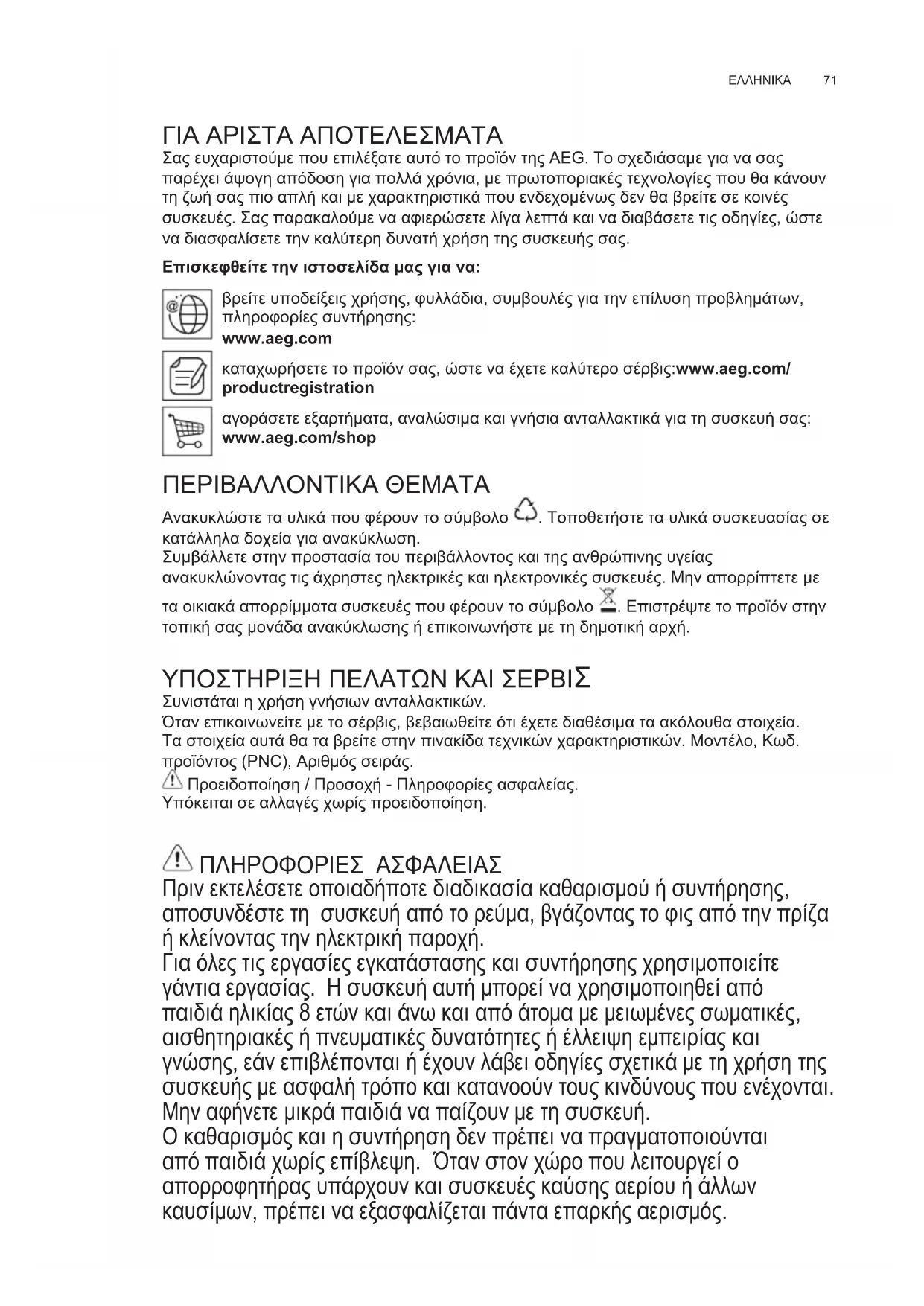 ΓΙΑ ΑΡΙΣΤΑ ΑΠΟΤΕΛΕΣΜΑΤΑ Σας ευχαριστούμε που επιλέξατε αυτό το προϊόν της AEG. Το σχεδιάσαμε για να σας παρέχει άψογη απόδοση για πολλά χρόνια, με πρωτοποριακές τεχνολογίες που θα κάνουν τη ζωή σας πιο απλή και με χαρακτηριστικά που ενδεχομένως δεν θα βρείτε σε κοινές συσκευές. Σας παρακαλούμε να αφιερώσετε λίγα λεπτά και να διαβάσετε τις οδηγίες, ώστε να διασφαλίσετε την καλύτερη δυνατή χρήση της συσκευής σας. Επισκεφθείτε την ιστοσελίδα μας για να: βρείτε υποδείξεις χρήσης, φυλλάδια, συμβουλές για την επίλυση προβλημάτων, πληροφορίες συντήρησης: www.aeg.com καταχωρήσετε το προϊόν σας, ώστε να έχετε καλύτερο σέρβις:www.aeg.com/ productregistration αγοράσετε εξαρτήματα, αναλώσιμα και γνήσια ανταλλακτικά για τη συσκευή σας: www.aeg.com/shop ΠΕΡΙΒΑΛΛΟΝΤΙΚΑ ΘΕΜΑΤΑ Ανακυκλώστε τα υλικά που φέρουν το σύμβολο . Τοποθετήστε τα υλικά συσκευασίας σε κατάλληλα δοχεία για ανακύκλωση. Συμβάλλετε στην προστασία του περιβάλλοντος και της ανθρώπινης υγείας ανακυκλώνοντας τις άχρηστες ηλεκτρικές και ηλεκτρονικές συσκευές. Μην απορρίπτετε με τα οικιακά απορρίμματα συσκευές που φέρουν το σύμβολο . Επιστρέψτε το προϊόν στην τοπική σας μονάδα ανακύκλωσης ή επικοινωνήστε με τη δημοτική αρχή. ΥΠΟΣΤΗΡΙΞΗ ΠΕΛΑΤΩΝ ΚΑΙ ΣΕΡΒΙΣ Συνιστάται η χρήση γνήσιων ανταλλακτικών. Όταν επικοινωνείτε με το σέρβις, βεβαιωθείτε ότι έχετε διαθέσιμα τα ακόλουθα στοιχεία. Τα στοιχεία αυτά θα τα βρείτε στην πινακίδα τεχνικών χαρακτηριστικών. Μοντέλο, Κωδ. προϊόντος (PNC), Αριθμός σειράς. Προειδοποίηση / Προσοχή - Πληροφορίες ασφαλείας. Υπόκειται σε αλλαγές χωρίς προειδοποίηση. ΠΛΗΡΟΦΟΡΙΕΣ ΑΣΦΑΛΕΙΑΣ Πριν εκτελέσετε οποιαδήποτε διαδικασία καθαρισμού ή συντήρησης, αποσυνδέστε τη συσκευή από το ρεύμα, βγάζοντας το φις από την πρίζα ή κλείνοντας την ηλεκτρική παροχή. Για όλες τις εργασίες εγκατάστασης και συντήρησης χρησιμοποιείτε γάντια εργασίας. Η συσκευή αυτή μπορεί να χρησιμοποιηθεί από παιδιά ηλικίας 8 ετών και άνω και από άτομα με μειωμένες σωματικές, αισθητηριακές ή πνευματικές δυνατότητες ή έλλειψη εμπειρίας και γνώσης, εάν επιβλέπονται ή έχουν λάβει οδηγίες σχετικά με τη χρήση της συσκευής με ασφαλή τρόπο και κατανοούν τους κινδύνους που ενέχονται. Μην αφήνετε μικρά παιδιά να παίζουν με τη συσκευή. Ο καθαρισμός και η συντήρηση δεν πρέπει να πραγματοποιούνται από παιδιά χωρίς επίβλεψη. Όταν στον χώρο που λειτουργεί ο απορροφητήρας υπάρχουν και συσκευές καύσης αερίου ή άλλων καυσίμων, πρέπει να εξασφαλίζεται πάντα επαρκής αερισμός. EL ΟΔΗΓΊΕΣ ΧΡΉΣΗΣwww.aeg.com