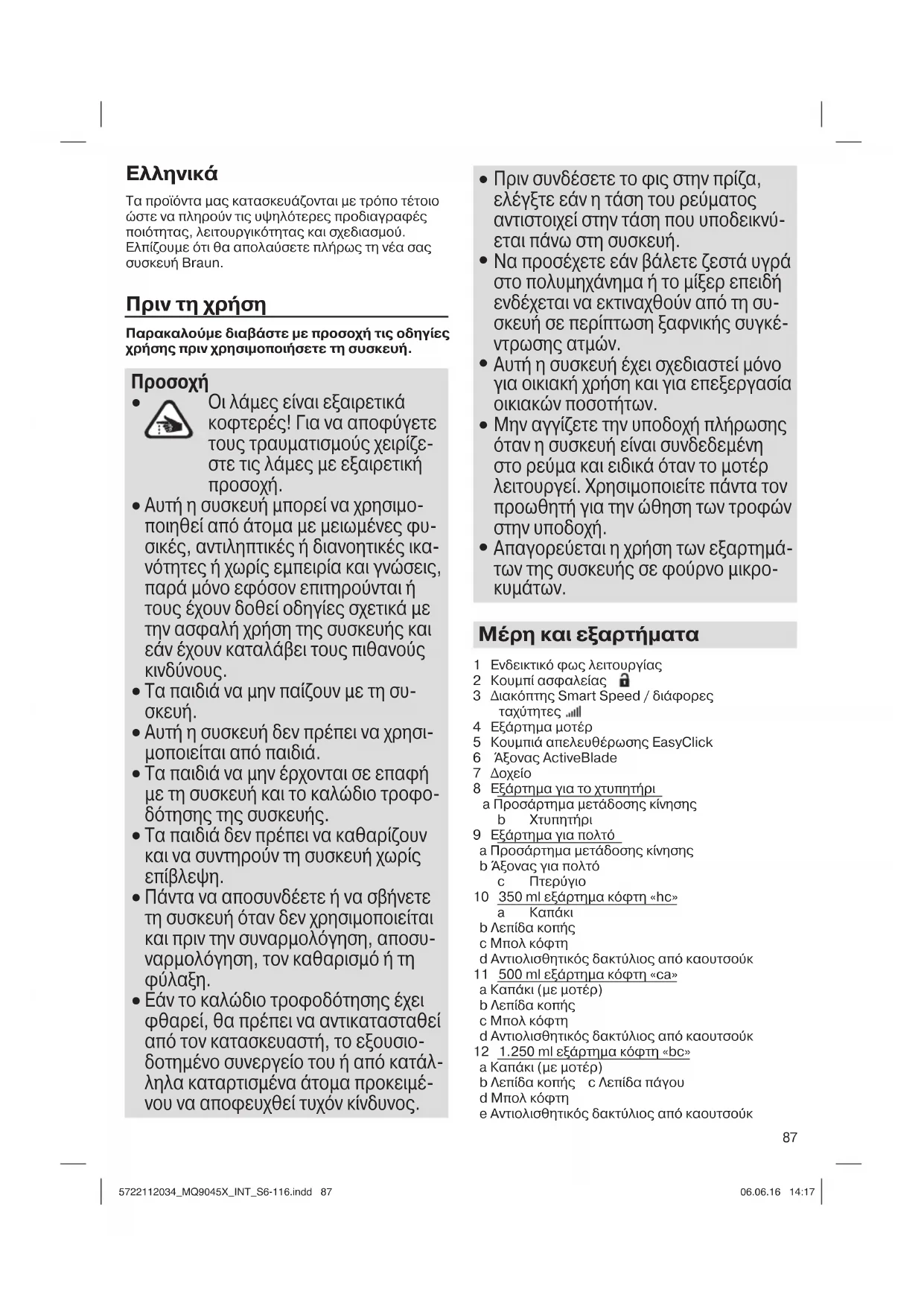 - Αν χρησιμοποιείτε τη συσκευή για να πολτοποιήσετε ζεστές τροφές σε κατσαρολάκι ή κατσαρόλα, αφαιρέστε το κατσαρολάκι ή την κατσαρόλα από τη πηγή θερμότητας και βεβαιωθείτε ότι δεν βράζει το υγρό. Αφήστε το ζεστό τρόφιμο να κρυώσει ελαφρώς, ώστε να μην υπάρχει κίνδυνος εγκαύματος. 5722112034_MQ9045X_INT_S6-116.indd 885722112034_MQ9045X_INT_S6-116.indd 88 06.06.16 14:1706.06.16 14:1789