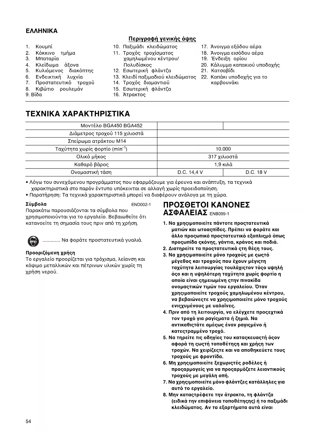 END002-1 Παρακάτω παρουσιάζονται τα σύμβολα που χρησιμοποιούνται για το εργαλείο. Βεβαιωθείτε τι κατανοείτε τη σημασία τους πριν απ τη χρήση. ............. Να φοράτε προστατευτικά γυαλιά. Προοριζµενη χρήση Το εργαλείο προορίζεται για τρχισμα, λείανση και κψιμο μεταλλικών και πέτρινων υλικών χωρίς τη χρήση νερού. ΠΡΟΣΘΕΤΟΙ ΚΑΝΟΝΕΣ ΑΣΦΑΛΕΙΑΣ ENB099-1