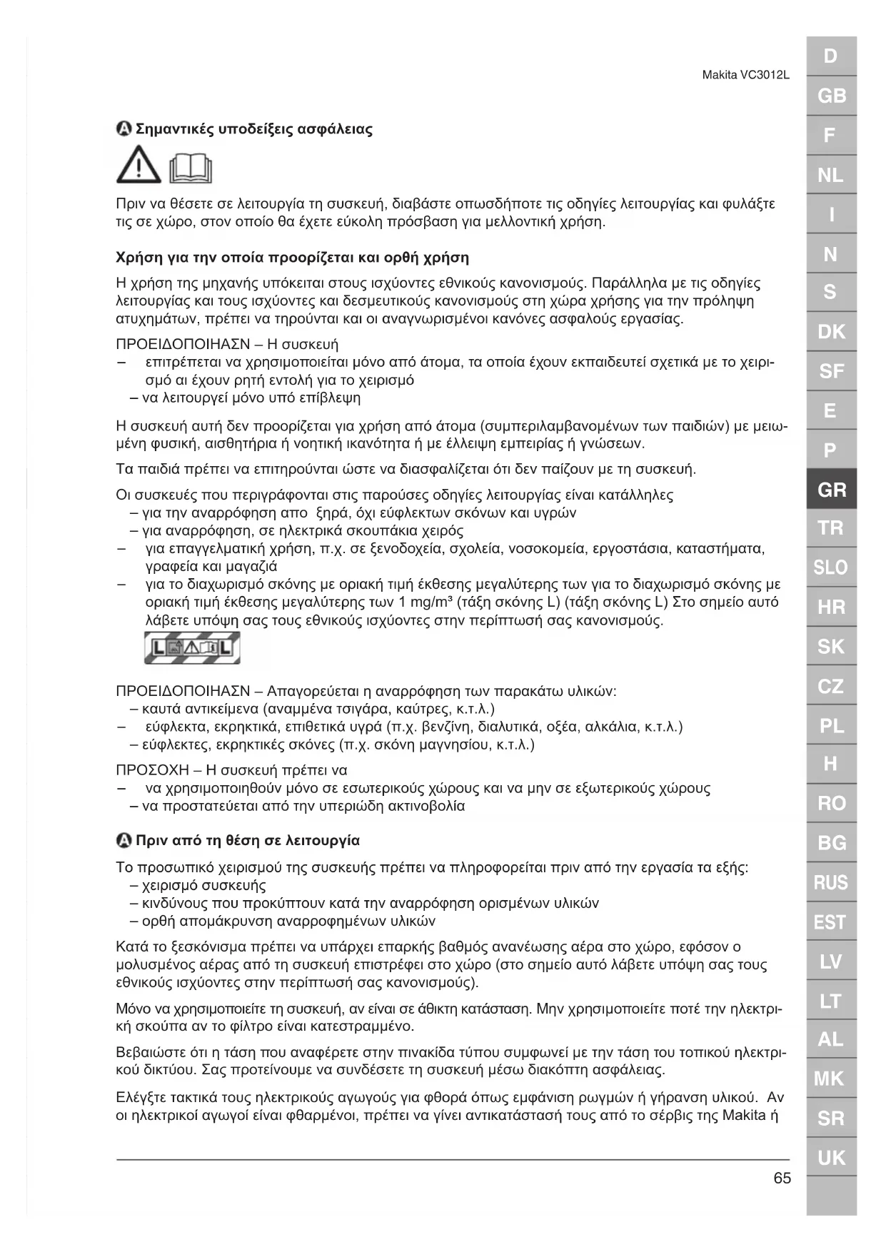 Makita VC3012L Σημαντικές υποδείξεις ασφάλειας Πριν να θέσετε σε λειτουργία τη συσκευή, διαβάστε οπωσδήποτε τις οδηγίες λειτουργίας και φυλάξτε τις σε χώρο, στον οποίο θα έχετε εύκολη πρόσβαση για μελλοντική χρήση. Χρήση για την οποία προορίζεται και ορθή χρήση Η χρήση της µηχανής υπόκειται στους ισχύοντες εθνικούς κανονισµούς. Παράλληλα µε τις οδηγίες λειτουργίας και τους ισχύοντες και δεσµευτικούς κανονισµούς στη χώρα χρήσης για την πρόληψη ατυχηµάτων, πρέπει να τηρούνται και οι αναγνωρισµένοι κανόνες ασφαλούς εργασίας. ΠΡΟΕΙΔΟΠΟΙΗΑΣΝ – Η συσκευή – επιτρέπεται να χρησιμοποιείται μόνο από άτομα, τα οποία έχουν εκπαιδευτεί σχετικά με το χειρι- σμό αι έχουν ρητή εντολή για το χειρισμό – να λειτουργεί μόνο υπό επίβλεψη Η συσκευή αυτή δεν προορίζεται για χρήση από άτομα (συμπεριλαμβανομένων των παιδιών) με μειω- μένη φυσική, αισθητήρια ή νοητική ικανότητα ή με έλλειψη εμπειρίας ή γνώσεων. Τα παιδιά πρέπει να επιτηρούνται ώστε να διασφαλίζεται ότι δεν παίζουν με τη συσκευή. Οι συσκευές που περιγράφονται στις παρούσες οδηγίες λειτουργίας είναι κατάλληλες – για την αναρρόφηση απο ξηρά, όχι εύφλεκτων σκόνων και υγρών – για αναρρόφηση, σε ηλεκτρικά σκουπάκια χειρός – για επαγγελματική χρήση, π.χ. σε ξενοδοχεία, σχολεία, νοσοκομεία, εργοστάσια, καταστήματα, γραφεία και μαγαζιά – για το διαχωρισμό σκόνης με οριακή τιμή έκθεσης μεγαλύτερης των για το διαχωρισμό σκόνης με οριακή τιμή έκθεσης μεγαλύτερης των 1 mg/m³ (τάξη σκόνης L) (τάξη σκόνης L) Στο σημείο αυτό λάβετε υπόψη σας τους εθνικούς ισχύοντες στην περίπτωσή σας κανονισμούς. ΠΡΟΕΙΔΟΠΟΙΗΑΣΝ – Απαγορεύεται η αναρρόφηση των παρακάτω υλικών: – καυτά αντικείμενα (αναμμένα τσιγάρα, καύτρες, κ.τ.λ.) – εύφλεκτα, εκρηκτικά, επιθετικά υγρά (π.χ. βενζίνη, διαλυτικά, οξέα, αλκάλια, κ.τ.λ.) – εύφλεκτες, εκρηκτικές σκόνες (π.χ. σκόνη μαγνησίου, κ.τ.λ.) ΠΡΟΣΟΧΗ – Η συσκευή πρέπει να – να χρησιμοποιηθούν μόνο σε εσωτερικούς χώρους και να μην σε εξωτερικούς χώρους – να προστατεύεται από την υπεριώδη ακτινοβολία Πριν από τη θέση σε λειτουργία Το προσωπικό χειρισμού της συσκευής πρέπει να πληροφορείται πριν από την εργασία τα εξής: – χειρισμό συσκευής – κινδύνους που προκύπτουν κατά την αναρρόφηση ορισμένων υλικών – ορθή απομάκρυνση αναρροφημένων υλικών Κατά το ξεσκόνισμα πρέπει να υπάρχει επαρκής βαθμός ανανέωσης αέρα στο χώρο, εφόσον ο μολυσμένος αέρας από τη συσκευή επιστρέφει στο χώρο (στο σημείο αυτό λάβετε υπόψη σας τους εθνικούς ισχύοντες στην περίπτωσή σας κανονισμούς). Μόνο να χρησιμοποιείτε τη συσκευή, αν είναι σε άθικτη κατάσταση. Μην χρησιμοποιείτε ποτέ την ηλεκτρι- κή σκούπα αν το φίλτρο είναι κατεστραμμένο. Βεβαιώστε ότι η τάση που αναφέρετε στην πινακίδα τύπου συμφωνεί με την τάση του τοπικού ηλεκτρι- κού δικτύου. Σας προτείνουμε να συνδέσετε τη συσκευή μέσω διακόπτη ασφάλειας. Ελέγξτε τακτικά τους ηλεκτρικούς αγωγούς για φθορά όπως εμφάνιση ρωγμών ή γήρανση υλικού. Αν οι ηλεκτρικοί αγωγοί είναι φθαρμένοι, πρέπει να γίνει αντικατάστασή τους από το σέρβις της Makita ήD