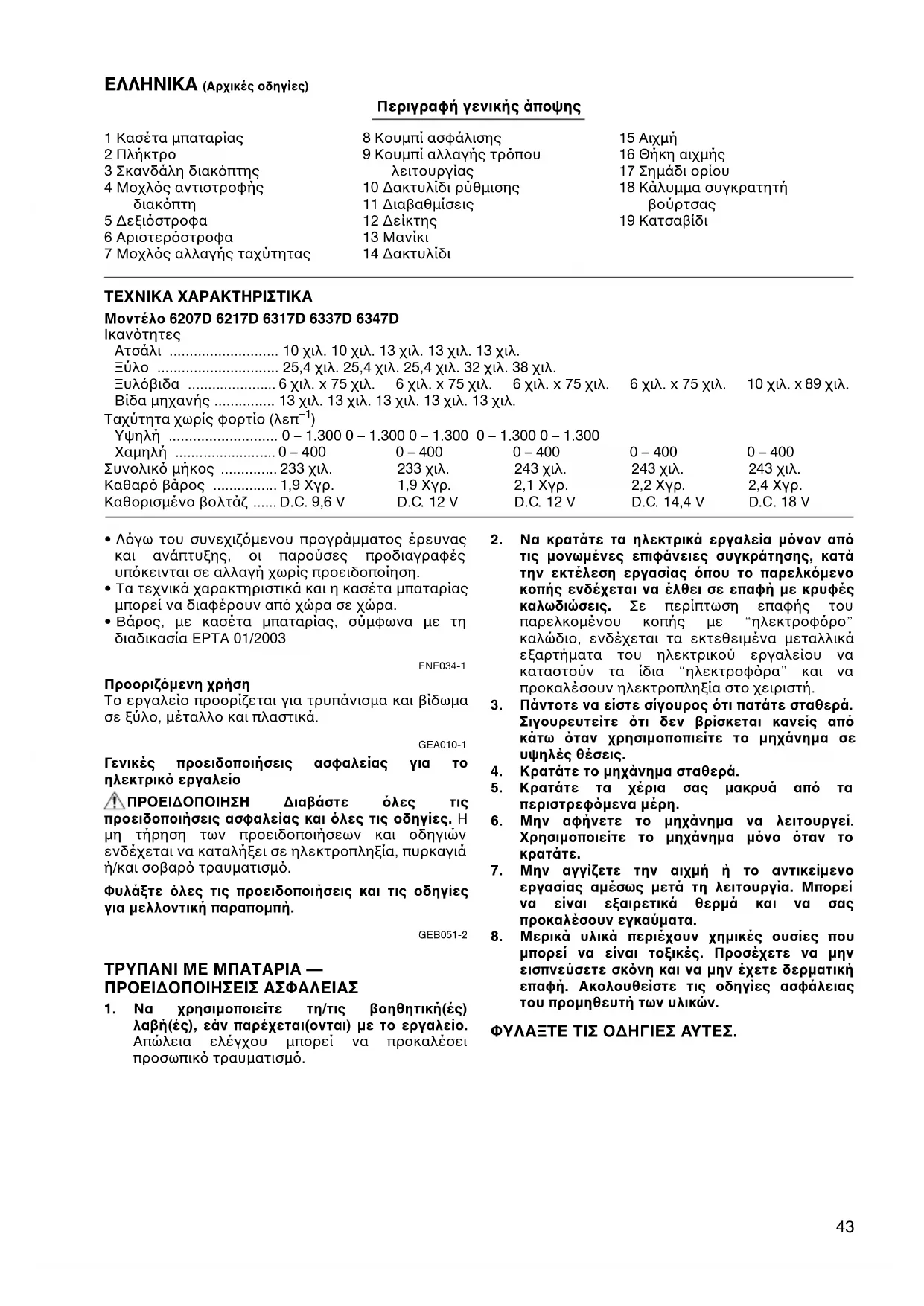 19 Κατσαβίδι ΤΕΧΝΙΚΑ ΧΑΡΑΚΤΗΡΙΣΤΙΚΑ Μοντέλο 6207D 6217D 6317D 6337D 6347D