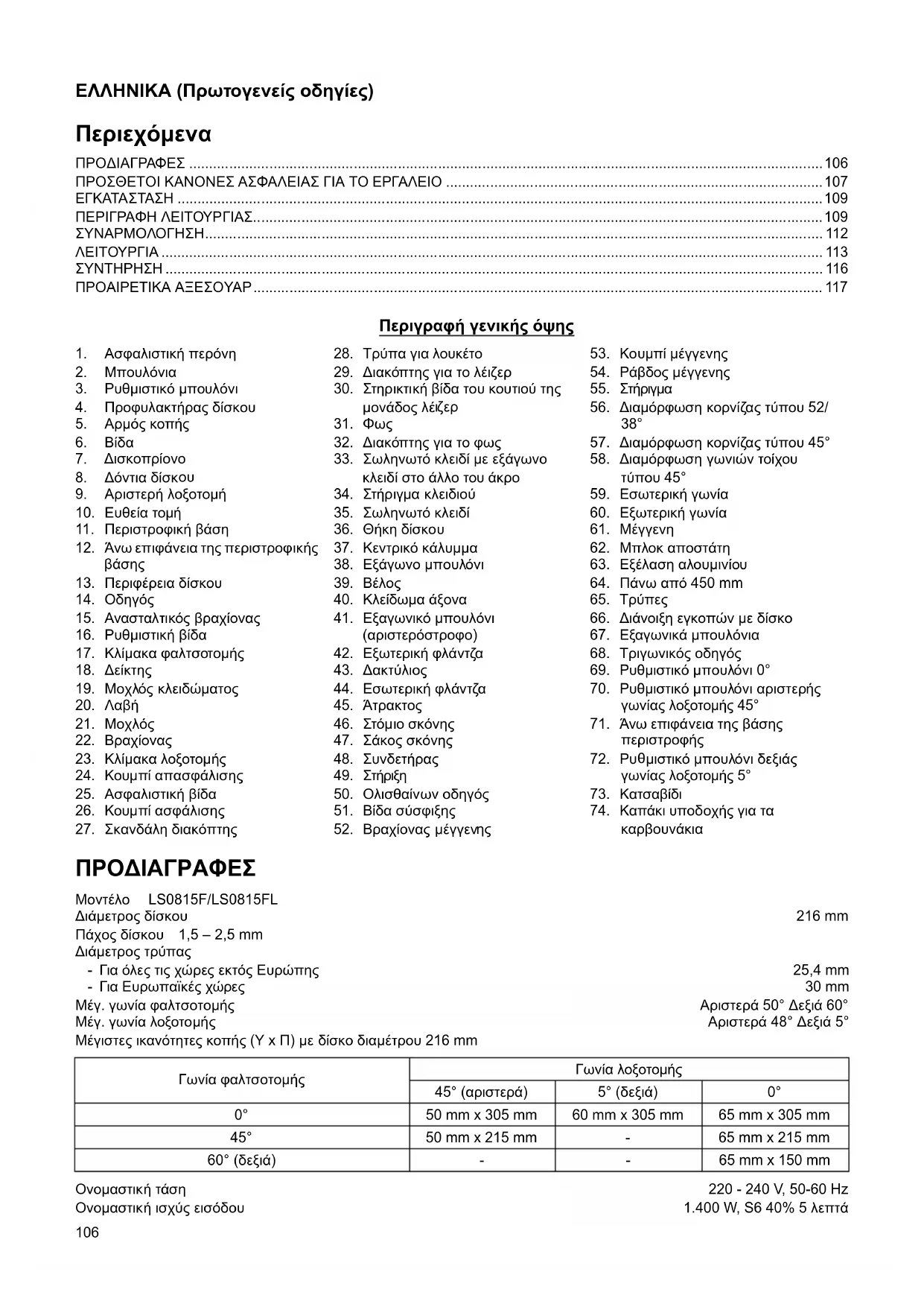 καρβουνάκια Γωνία φαλτσοτομής Γωνία λοξοτομής 45° (αριστερά)5° (δεξιά)0° 0° 50 mm x 305 mm 60 mm x 305 mm 65 mm x 305 mm 45° 50 mm x 215 mm - 65 mm x 215 mm 60° (δεξιά) - - 65 mm x 150 mm107 Ταχύτητα χωρίς φορτίο (min
