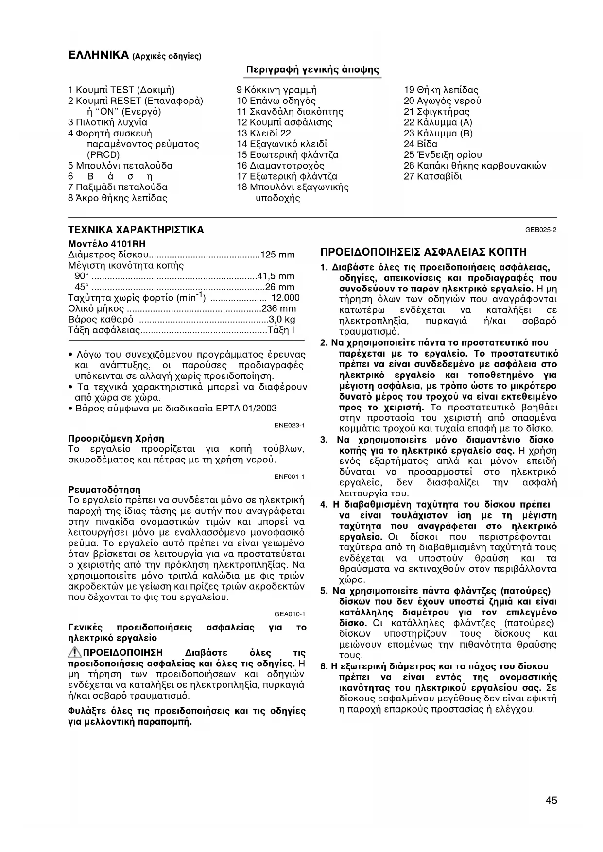 - Μνο για τις χώρες της ΕΕ Μη πετάτε τα είδη ηλεκτρικού εξοπλισμού μαζί με τα οικιακά απορρίμματα. Σε τήρηση της Eυρωπαϊκής Oδηγίας 2002/96/ΕΚ, περί απορριμμάτων ειδών ηλεκτρικού και ηλεκτρονικού εξοπλισμού και την εφαρμογή της σύμφωνα με την εθνική νομοθεσία, τα είδη ηλεκτρικού εξοπλισμού που έχουν φθάσει στο τέλος της ζωής τους πρέπει να συλλέγονται ξεχωριστά και να επιστρέφονται σε μιά περιβαλλοντικά συμβατή εγκατάσταση ανακύκλωσης.7 ENGLISH (Original instructions) Explanation of general view 1 TEST button 2 RESET or “ON” button 3 Pilot lamp 4 Portable residual current device (PRCD) 5 Wing bolt 6Base 7 Wing nut 8 End of blade case 9 Red line 10 Top guide 11 Switch trigger 12 Lock-off button 13 Wrench 22 14 Hex wrench 15 Inner flange 16 Diamond wheel 17 Outer flange 18 Hex socket head bolt 19 Blade case 20 Water pipe 21 Clamp 22 Cover (A) 23 Cover (B) 24 Screw 25 Limit mark 26 Brush holder cap 27 Screwdriver SPECIFICATIONS Model 4101RH Wheel diameter ................................................ 125 mm Max. cutting capacities 90° ................................................................ 41.5 mm 45° ................................................................... 26 mm No load speed (min