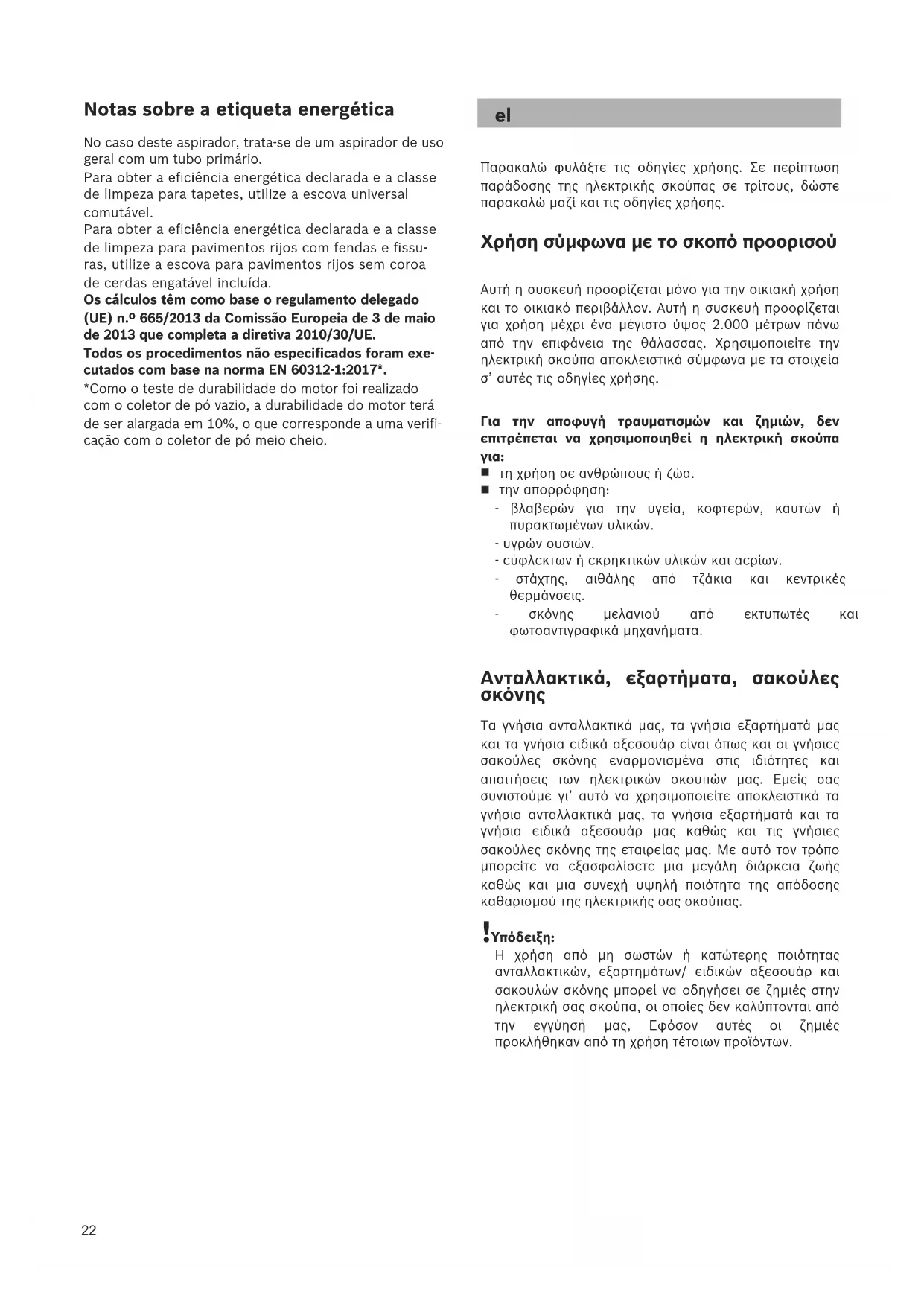 Τα φίλτρα και οι σακούλες των φίλτρων έχουν κατασκευαστεί από φιλικά προς το περιβάλλον υλικά. Εφόσον δεν περιλαµβάνουν ουσίες, που απαγορεύονται για τα οικιακά απορρίµµατα, µπορούν να αποσυρθούν µαζί µε τα κανονικά οικιακά απορρίµµατα. Υποδείξεις για την ενεργειακή ετικέτα Αυτή η ηλεκτρική σκούπα πρόκειται για μια ηλεκτρική σκούπα γενικής χρήσης. Για την επίτευξη της αναφερόμενης ενεργειακής απόδο- σης και κατηγορίας καθαρισμού σε σκληρό δάπεδο με αρμούς και σχισμές χρησιμοποιήστε παρακαλώ το συμπα- ραδιδόμενο πέλμα σκληρού δαπέδου χωρίς το προσα- ρτώμενο βουρτσάκι. Οι υπολογισμοί βασίζονται στον κατ’ εξουσιοδότηση κανονισμό (ΕΕ) αριθ. 665/2013 της Επιτροπής από 3 Μαΐου 2013 για συμπλήρωμα της οδηγίας 2010/30/ΕΕ. Όλες οι διαδικασίες, που δεν περιγράφον- ται ακριβώς σε αυτές τις οδηγίες, εκτελέστηκαν στη βάση του προτύπου EN 60312-1:2017*. *Επειδή η δοκιμή διάρκειας ζωής για τον κινητήρα εκτε- λείται με άδειο δοχείο σκόνης, πρέπει η αναφερόμενη διάρκεια ζωής του κινητήρα για έλεγχο με μισογεμάτο δοχείο σκόνης να αυξηθεί κατά 10%.25