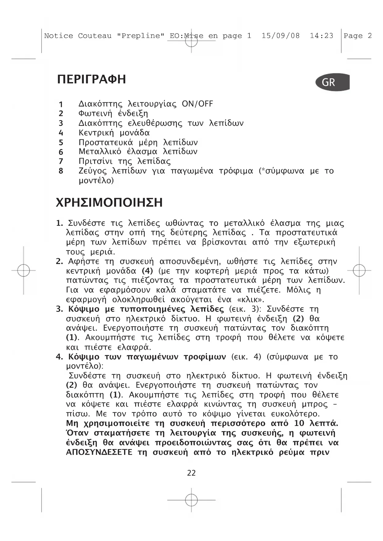 Notice Couteau "Prepline" EO:Mise en page 1 15/09/08 14:23 Page 2223 αφαιρέσετε τις λείδες. Η φωτεινή ένδειξη είσης σας ενηµερώνει ότι η συσκευή συνεχίζει να είναι συνδεδεµένη µε το ηλεκτρικό ρεύµα. ΠΡΟΣΟΧΗ : Η συσκευή αυτή όταν είναι συνδεδεµένη µε το ηλεκτρικό ρεύµα είναι εικίνδυνη για τα αιδιά.