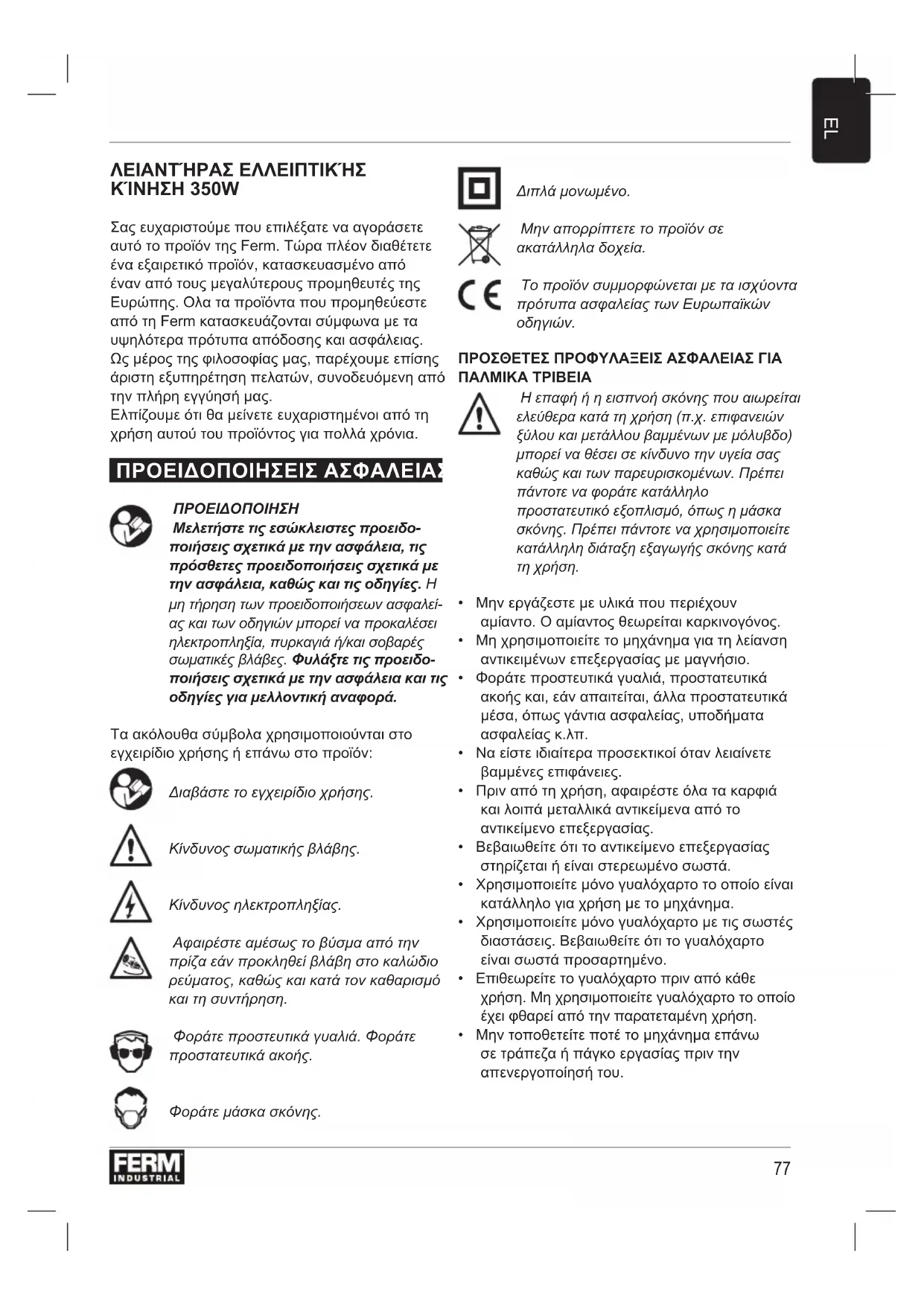 ΛΕΙΑΝΤΉΡΑΣ ΕΛΛΕΙΠΤΙΚΉΣ ΚΊΝΗΣΗ 350W Σας ευχαριστούμε που επιλέξατε να αγοράσετε αυτό το προϊόν της Ferm. Τώρα πλέον διαθέτετε ένα εξαιρετικό προϊόν, κατασκευασμένο από έναν από τους μεγαλύτερους προμηθευτές της Ευρώπης. Ολα τα προϊόντα που προμηθεύεστε από τη Ferm κατασκευάζονται σύμφωνα με τα υψηλότερα πρότυπα απόδοσης και ασφάλειας. Ως μέρος της φιλοσοφίας μας, παρέχουμε επίσης άριστη εξυπηρέτηση πελατών, συνοδευόμενη από την πλήρη εγγύησή μας. Ελπίζουμε ότι θα μείνετε ευχαριστημένοι από τη χρήση αυτού του προϊόντος για πολλά χρόνια. ΠΡΟΕΙΔΟΠΟΙΗΣΕΙΣ ΑΣΦΑΛΕΙΑΣ ΠΡΟΕΙΔΟΠΟΙΗΣΗ Μελετήστετιςεσώκλειστεςπροειδο- ποιήσειςσχετικάμετηνασφάλεια,τις πρόσθετεςπροειδοποιήσειςσχετικάμε τηνασφάλεια,καθώςκαιτιςοδηγίες. Η μη τήρηση των προειδοποιήσεων ασφαλεί- ας και των οδηγιών μπορεί να προκαλέσει ηλεκτροπληξία, πυρκαγιά ή/και σοβαρές σωματικές βλάβες. Φυλάξτετιςπροειδο- ποιήσειςσχετικάμετηνασφάλειακαιτις οδηγίεςγιαμελλοντικήαναφορά. Τα ακόλουθα σύμβολα χρησιμοποιούνται στο εγχειρίδιο χρήσης ή επάνω στο προϊόν: Διαβάστε το εγχειρίδιο χρήσης. Κίνδυνος σωματικής βλάβης. Κίνδυνος ηλεκτροπληξίας. Αφαιρέστε αμέσως το βύσμα από την πρίζα εάν προκληθεί βλάβη στο καλώδιο ρεύματος, καθώς και κατά τον καθαρισμό και τη συντήρηση. Φοράτε προστευτικά γυαλιά. Φοράτε προστατευτικά ακοής. Φοράτε μάσκα σκόνης. Διπλά μονωμένο. Μην απορρίπτετε το προϊόν σε ακατάλληλα δοχεία. Το προϊόν συμμορφώνεται με τα ισχύοντα πρότυπα ασφαλείας των Ευρωπαϊκών