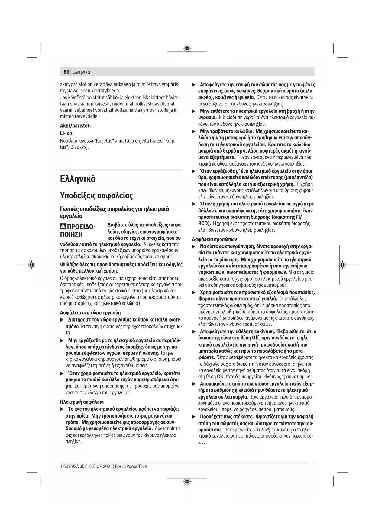 1 609 92A 85Y | (15.07.2022) Bosch Power ToolsΕλληνικά | 87 u Φοράτε σωστή ενδυμασία. Μη φοράτε φαρδιά ρούχα ή κοσμήματα. Κρατάτε τα μαλλιά και τα ρούχα σας μα- κριά από τα κινούμενα εξαρτήματα. Χαλαρή ενδυμασία, κοσμήματα ή μακριά μαλλιά μπορεί να εμπλακούν στα κι- νούμενα εξαρτήματα. u Όταν υπάρχει η δυνατότητα σύνδεσης διατάξεων αναρ- ρόφησης ή συλλογής σκόνης, βεβαιωθείτε ότι αυτές εί- ναι συνδεδεμένες και ότι χρησιμοποιούνται σωστά. Η χρήση μιας αναρρόφησης σκόνης μπορεί να ελαττώσει τον κίνδυνο που προκαλείται από τη σκόνη. u Μην εφησυχάζετε σε μια λάθος ασφάλεια και μην αψη- φάτε τους κανόνες ασφαλείας για τα ηλεκτρικά εργα- λεία, ακόμα και όταν μετά από συχνή χρήση είστε εξοι- κειωμένοι με το εργαλείο. Ένας απρόσεκτος χειρισμός μπορεί μέσα σε κλάσματα του δευτερολέπτου να οδηγήσει σε σοβαρούς τραυματισμούς. Χρήση και φροντίδα των ηλεκτρικών εργαλείων u Μην υπερφορτώνετε το ηλεκτρικό εργαλείο. Χρησιμο- ποιήστε το σωστό ηλεκτρικό εργαλείο για την εφαρμο- γή σας. Με το κατάλληλο ηλεκτρικό εργαλείο εργάζεστε καλύτερα και ασφαλέστερα στην αναφερόμενη περιοχή