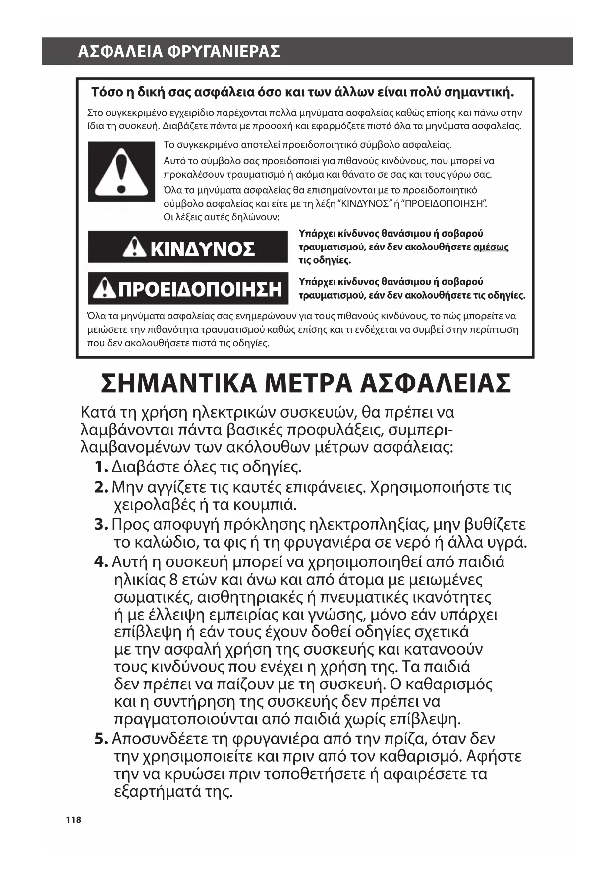 - Εξυπηρέτηση πελατών ΠΙΝΑΚΑΣ ΠΕΡΙΕΧΟΜΕΝΝ W10506838B_08_GR.indd 117 2/12/14 8:30 AM118 ΑΣΦΑΛΕΙΑ ΦΡΥΓΑΝΙΕΡΑΣΑΣΦΑΛΕΙΑ ΦΡΥΓΑΝΙΕΡΑΣ Τόσο η δική σας ασφάλεια όσο και των άλλων είναι πολύ σημαντική. Στο συγκεκριμένο εγχειρίδιο παρέχονται πολλά μηνύματα ασφαλείας καθώς επίσης και πάνω στην ίδια τη συσκευή. Διαβάζετε πάντα με προσοxή και εφαρμόζετε πιστά όλα τα μηνύματα ασφαλείας. Το συγκεκριμένο αποτελεί προειδοποιητικό σύμβολο ασφαλείας. Αυτό το σύμβολο σας προειδοποιεί για πιθανούς κινδύνους, που μπορεί να προκαλέσουν τραυματισμό ή ακόμα και θάνατο σε σας και τους γύρω σας. Όλα τα μηνύματα ασφαλείας θα επισημαίνονται με το προειδοποιητικό σύμβολο ασφαλείας και είτε με τη λέξη “ΚΙΝΔΥΝΟΣ” ή “ΠΡΟΕΙΔΟΠΟΙΗΣΗ”. Οι λέξεις αυτές δηλώνουν:Υπάρχει κίνδυνος θανάσιμου ή σοβαρού τραυματισμού, εάν δεν ακολουθήσετε αμέσως τις οδηγίες.Υπάρχει κίνδυνος θανάσιμου ή σοβαρού τραυματισμού, εάν δεν ακολουθήσετε τις οδηγίες. Όλα τα μηνύματα ασφαλείας σας ενημερώνουν για τους πιθανούς κινδύνους, το πώς μπορείτε να μειώσετε την πιθανότητα τραυματισμού καθώς επίσης και τι ενδέχεται να συμβεί στην περίπτωση που δεν ακολουθήσετε πιστά τις οδηγίες. p. 132