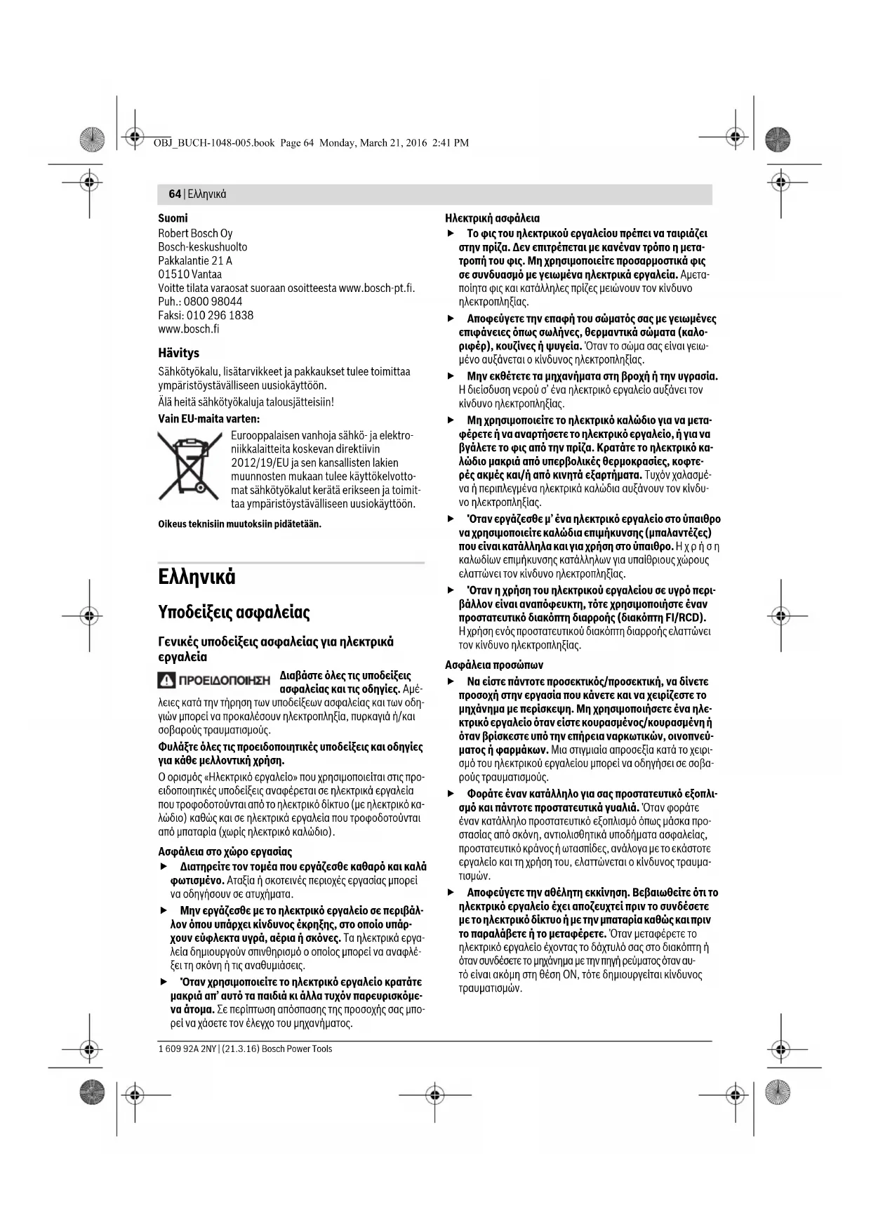 Αποφεύγετε την αθέλητη εκκίνηση. Βεβαιωθείτε ότι το ηλεκτρικό εργαλείο έχει αποζευχτεί πριν το συνδέσετε με το ηλεκτρικό δίκτυο ή με την μπαταρία καθώς και πριν το παραλάβετε ή το μεταφέρετε. Όταν μεταφέρετε το ηλεκτρικό εργαλείο έχοντας το δάχτυλό σας στο διακόπτη ή όταν συνδέσετε το μηχάνημα με την πηγή ρεύματος όταν αυ- τό είναι ακόμη στη θέση ΟΝ, τότε δημιουργείται κίνδυνος τραυματισμών. OBJ_BUCH-1048-005.book Page 64 Monday, March 21, 2016 2:41 PMΕλληνικά | 65 Bosch Power Tools 1 609 92A 2NY | (21.3.16) Αφαιρείτε από τα ηλεκτρικά εργαλεία τυχόν συναρμο- λογημένα εργαλεία ρύθμισης ή κλειδιά πριν θέσετε το ηλεκτρικό εργαλείο σε λειτουργία. Ένα εργαλείο ή κλειδί συναρμολογημένο σ’ ένα περιστρεφόμενο τμήμα ενός μηχανήματος μπορεί να οδηγήσει σε τραυματισμούς. Μην υπερεκτιμάτε τον εαυτό σας. Φροντίζετε για την ασφαλή στάση του σώματός σας και διατηρείτε πάντοτε την ισορροπία σας. Έτσι μπορείτε να ελέγξετε καλύτερα το μηχάνημα σε περιπτώσεις απροσδόκητων περιστάσεων. Φοράτε κατάλληλα ενδύματα. Μη φοράτε φαρδιά ρού- χα ή κοσμήματα. Κρατάτε τα μαλλιά σας, τα ρούχα σας και τα γάντια σας μακριά από κινούμενα εξαρτήματα. Χα- λαρή ενδυμασία, κοσμήματα ή μακριά μαλλιά μπορεί να εμπλακούν στα κινούμενα εξαρτήματα. Όταν υπάρχει η δυνατότητα συναρμολόγησης διατάξε- ων αναρρόφησης ή συλλογής σκόνης, βεβαιωθείτε ότι αυτές είναι συνδεμένες με το μηχάνημα καθώς και ότι χρησιμοποιούνται σωστά. Η χρήση μιας αναρρόφησης σκόνης μπορεί να ελαττώσει τον κίνδυνο που προκαλείται από τη σκόνη. Επιμελής χειρισμός και χρήση ηλεκτρικών εργαλείων Μην υπερφορτώνετε το μηχάνημα. Χρησιμοποιείτε για την εκάστοτε εργασία το ηλεκτρικό εργαλείο που προορίζεται γι’ αυτήν. Με το κατάλληλο ηλεκτρικό εργα- λείο εργάζεστε καλύτερα και ασφαλέστερα στην αναφερό- μενη περιοχή ισχύος. Μη χρησιμοποιήσετε ποτέ ένα μηχάνημα που έχει χαλα- σμένο διακόπτη. Ένα ηλεκτρικό εργαλείο που δεν μπορείτε πλέον να το θέσετε σε λειτουργία και/ή εκτός λειτουργίας εί- ναι επικίνδυνο και πρέπει να επισκευαστεί. Βγάλτε το φις από την πρίζα και/ή αφαιρέστε την μπατα- ρία πριν διεξάγετε στο μηχάνημα μια οποιαδήποτε εργα- σία ρύθμισης, πριν αλλάξετε ένα εξάρτημα ή όταν πρό- κειται να διαφυλάξετε/να αποθηκεύσετε το μηχάνημα. Αυτά τα προληπτικά μέτρα ασφαλείας μειώνουν τον κίνδυνο από τυχόν αθέλητη εκκίνηση του ηλεκτρικού εργαλείου. Διαφυλάγετε τα ηλεκτρικά εργαλεία που δε χρησιμοποι- είτε μακριά από παιδιά. Μην επιτρέψετε τη χρήση του μηχανήματος σε άτομα που δεν είναι εξοικειωμένα μ’ αυτό ή δεν έχουν διαβάσει τις παρούσες οδηγίες. Τα ηλε- κτρικά εργαλεία είναι επικίνδυνα όταν χρησιμοποιούνται από άπειρα πρόσωπα. Να περιποιείστε προσεκτικά το ηλεκτρικό εργαλείο. Ελέγχετε, αν τα κινούμενα εξαρτήματα λειτουργούν άψογα, χωρίς να μπλοκάρουν, ή μήπως έχουν σπάσει ή φθαρεί τυχόν εξαρτήματα τα οποία επηρεάζουν τον τρό- πο λειτουργίας του ηλεκτρικού εργαλείου. Δώστε αυτά τα χαλασμένα εξαρτήματα για επισκευή πριν τα ξανα- χρησιμοποιήσετε. Η κακή συντήρηση των ηλεκτρικών ερ- γαλείων αποτελεί αιτία πολλών ατυχημάτων. Διατηρείτε τα εργαλεία κοπής κοφτερά και καθαρά. Προσεκτικά συντηρημένα κοπτικά εργαλεία σφηνώνουν δυσκολότερα και οδηγούνται ευκολότερα. Χρησιμοποιείτε τα ηλεκτρικά εργαλεία, εξαρτήματα, πα- ρελκόμενα εργαλεία κτλ. σύμφωνα με τις παρούσες οδηγίες. Λαμβάνετε επίσης υπόψη σας τις εκάστοτε συν- θήκες και την υπό εκτέλεση ερ