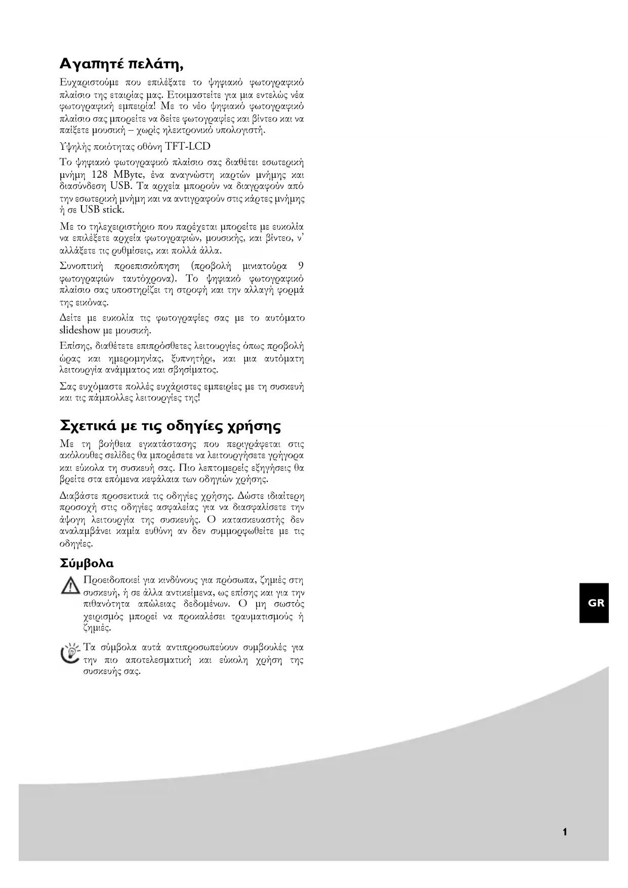 Ευχαριστούμε που επιλέξατε το ψηφιακό φωτογραφικό πλαίσιο της εταιρίας μας. Ετοιμαστείτε για μια εντελώς νέα φωτογραφική εμπειρία! Με το νέο ψηφιακό φωτογραφικό πλαίσιο σας μπορείτε να δείτε φωτογραφίες και βίντεο και να παίξετε μουσική – χωρίς ηλεικτρονικό υπολογιστή.